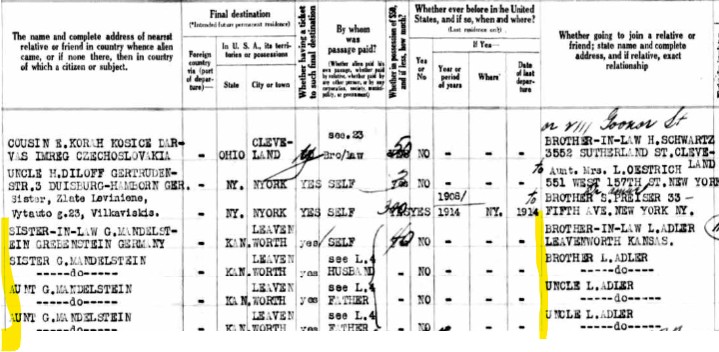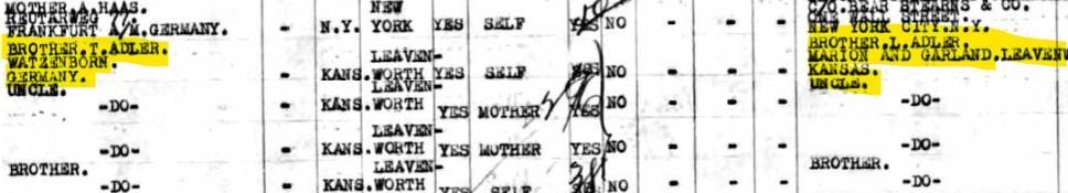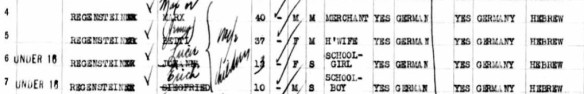 Interestingly, Betti, the youngest of those still in Germany, was the first to leave. She, her husband Marx Regenstein, and their two children Lucie and Erich sailed from Cherbourg, France, on April 29, 1936, and arrived in New York on May 6, 1936. Notice that all the first names were changed on the manifest. Marx became Max, Betti became Jenny, and Lucie was no longer Johanna, Erich no longer Siegfried. Max listed his occupation as a merchant on the ship manifest. They listed their destination as Leavenworth, Kansas, identifying Betti/Jenny’s brother Louis Adler as the person they were going to.