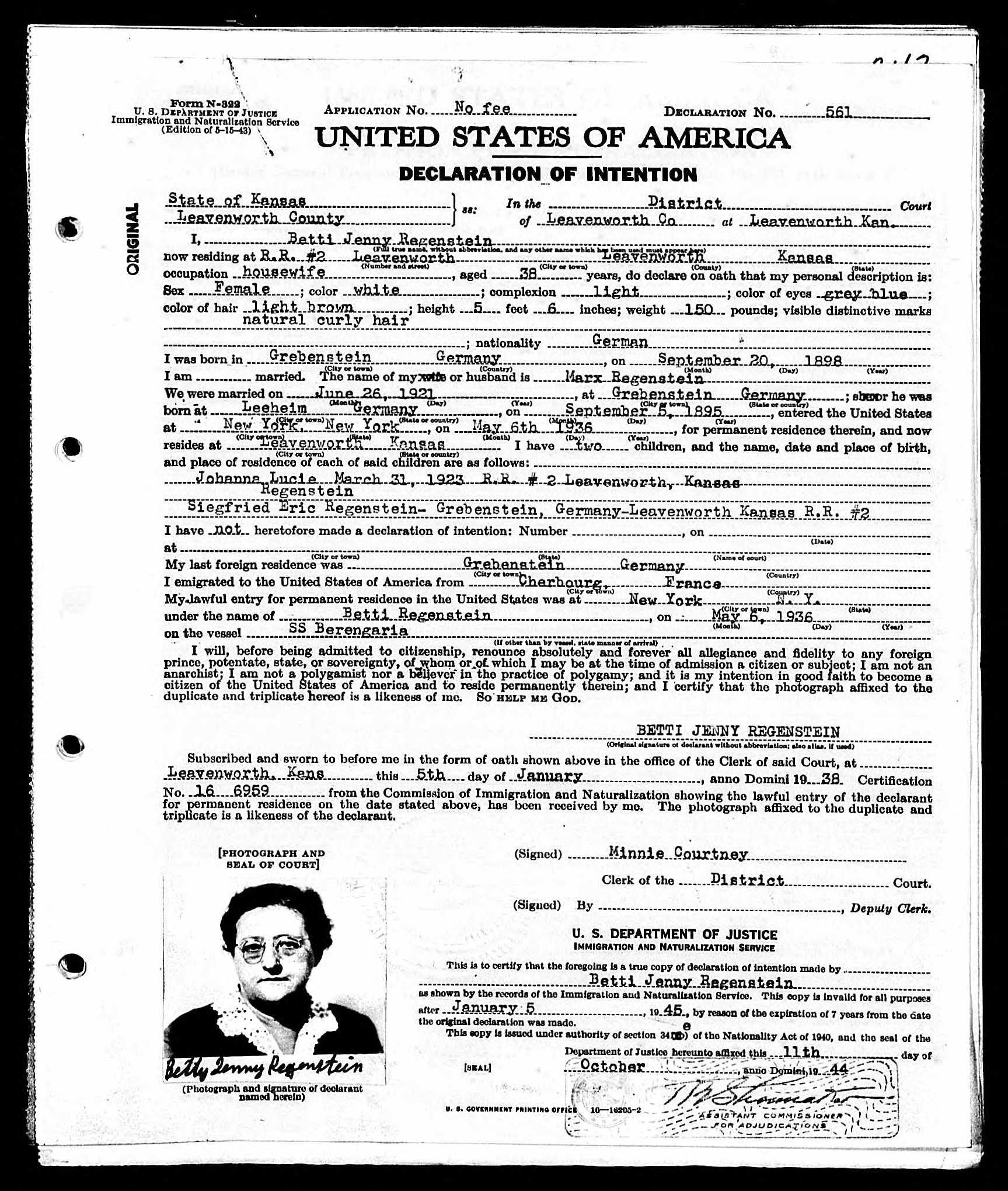 Betti Jenny Regenstein Declaration of Intention, National Archives at Chicago; Chicago, Illinois; ARC Title: Petitions For Naturalization, 1906-1991; NAI Number: M1285; Record Group Title: Records of District Courts of the United States, 1685-2009; Record Group Number: Rg 21, Petitions, V· 1243-1245, No· 309401-309950, 1944, Ancestry.com. Illinois, U.S., Federal Naturalization Records, 1856-1991