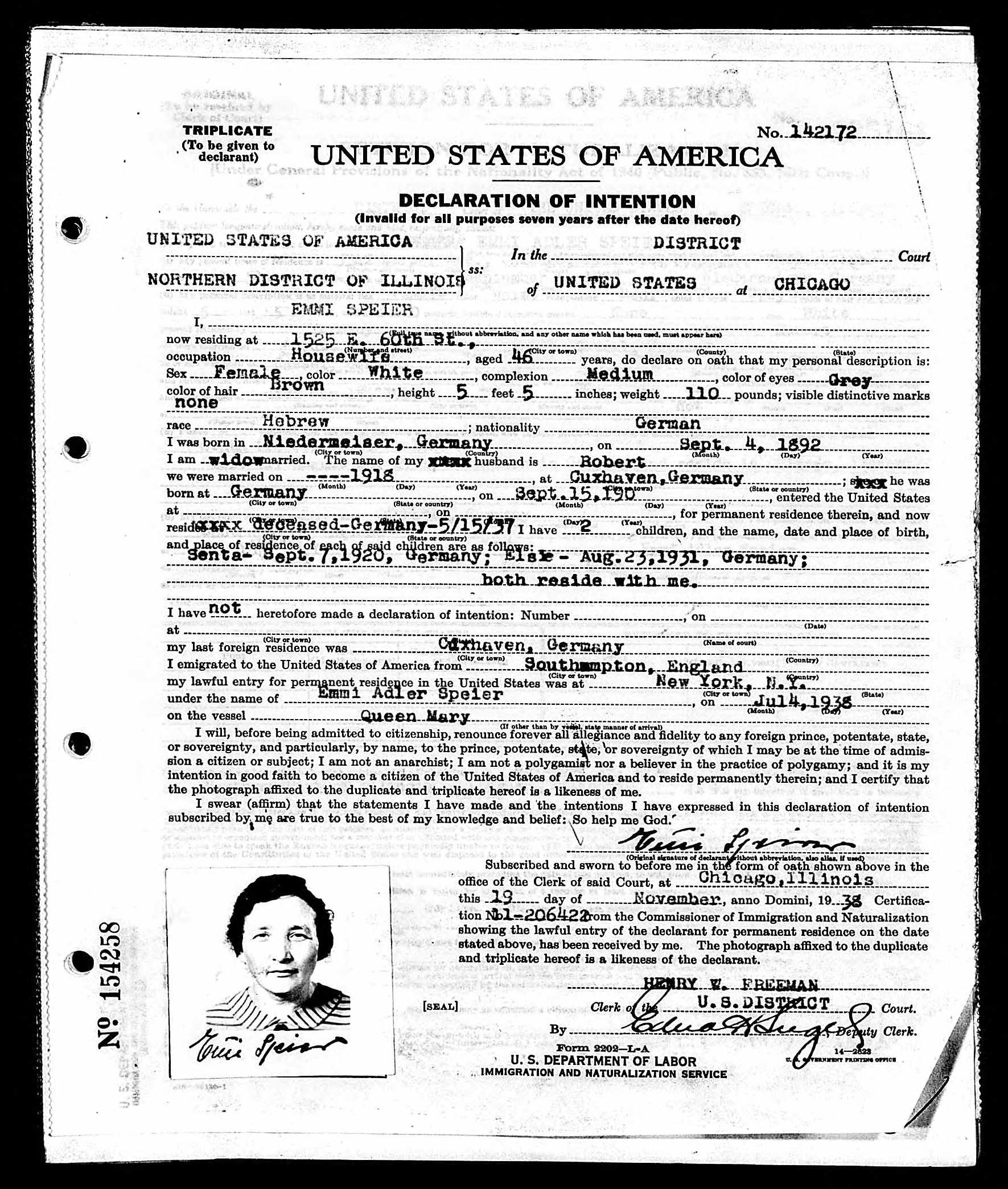 Emmi Adler Speier declaration of intention, National Archives at Chicago; Chicago, Illinois; ARC Title: Petitions For Naturalization, 1906-1991; NAI Number: M1285; Record Group Title: Records of District Courts of the United States, 1685-2009; Record Group Number: Rg 21