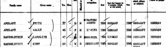Mandelstein and Apolant passenger manifest, The National Archives in Washington, DC; Washington, DC, USA; Passenger and Crew Lists of Vessels Arriving at New York, New York, 1897-1957; Microfilm Serial or NAID: T715; RG Title: Records of the Immigration and Naturalization Service, 1787-2004; RG: 85, Ship or Roll Number: Queen Mary, Ancestry.com. New York, U.S., Arriving Passenger and Crew Lists (including Castle Garden and Ellis Island), 1820-1957