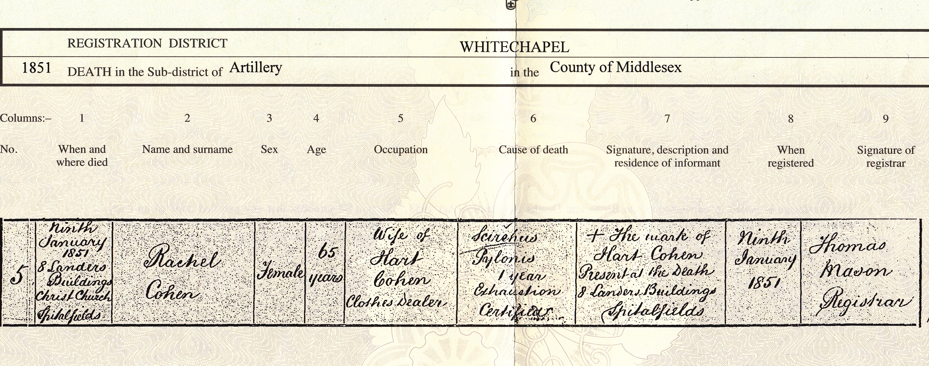 The certificate also indicates where the family was living—in Landers Buildings in Christchurch, Spitalfields, in the Registration District of Whitechapel, County of Middlesex.  It also confirms that Hart Levy Cohen was a clothes dealer.