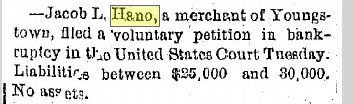 The other children of Ernst and Clarissa were also getting married in the late 1870s. Fannie Nusbaum married Jacob L. Hano on February 28, 1877, and they also had two children born by 1880: Louis F. Hano, born in Youngstown, Ohio, on November 30, 1877, and Ernst Nusbaum Hano, born May 16, 1880, also in Youngstown, Ohio. Jacob Hano was born in Philadelphia in 1850 and had lived his whole life there. In 1874 he’d been working as a salesman in Philadelphia, residing at 2026 Green Street, right across the street from Fannie and her family. He had attended Crittenden’s Philadelphia Commercial College. Perhaps he moved Fannie to Youngstown after they married because he believed that there were better business opportunities there. Unfortunately, however, like others in the family and the country, he faced financial problems and declared bankruptcy in May, 1878.
