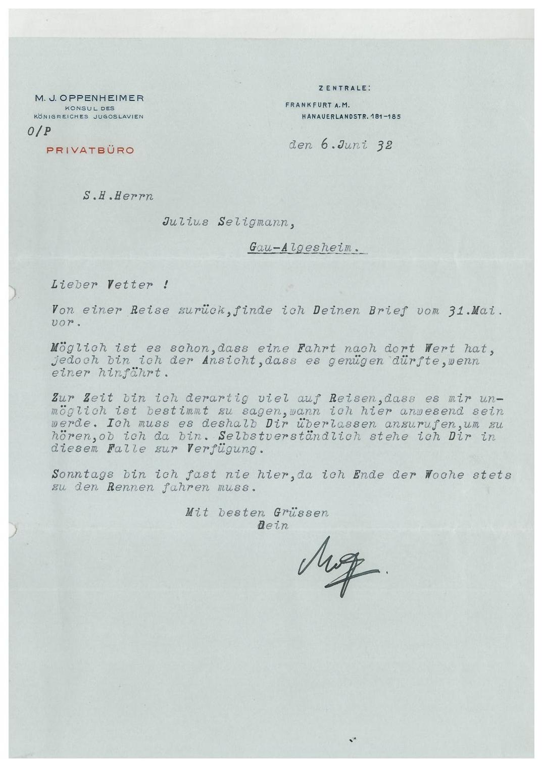 In June, 1932, Julius received the following letter from his cousin Moritz Oppenheimer. Moritz, who I wrote about here, was both a successful businessman and a horse breeder with a large stud farm.