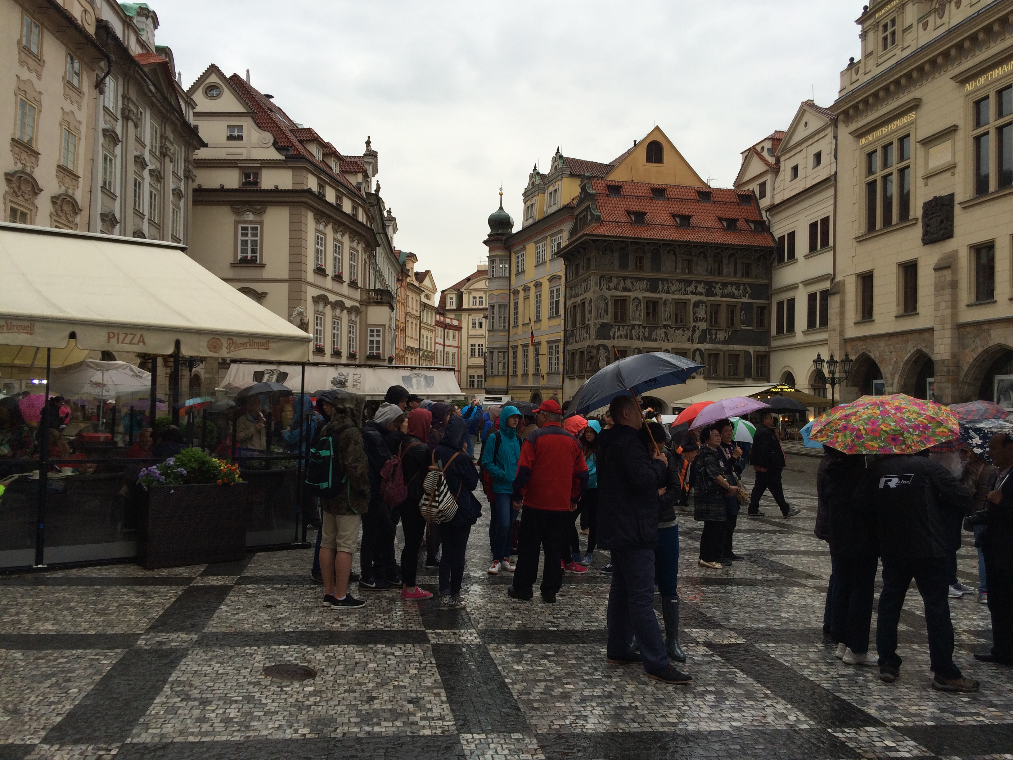 The buildings of Old Town do look like something out of a medieval fairytale—ornate and colorful and built at unpredictable angles that make it seem as if they were created as part of a dream, not a result of any city planning. The medieval clock with its many faces only adds to the aura of fantasy. Despite the rain and the many umbrellas raised by the numerous tourists crowding the square, it was enchanting to watch the skeleton start to nod his head and the other three figures—humans defying death—move as the clock began to strike six. Unlike the clock in Cinderella which ended her magical time, this clock began our magical time in Prague.