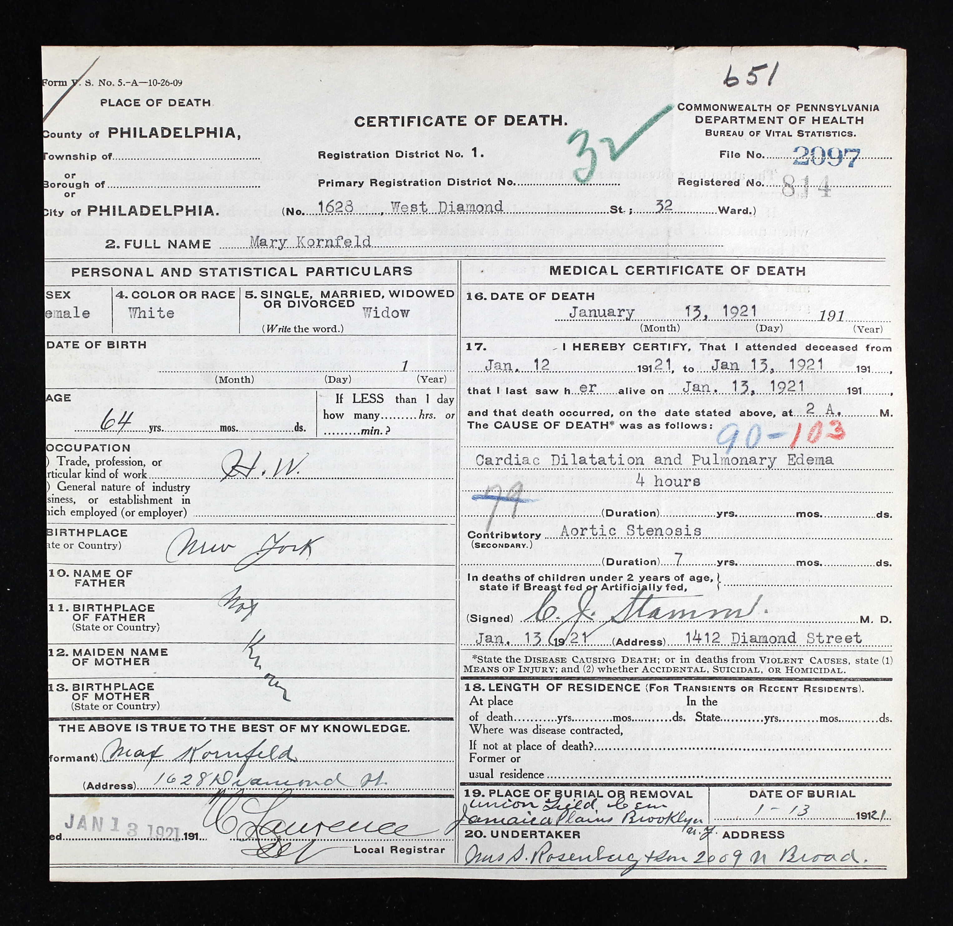Mary Seligman Kornfeld must have moved in with her son Max and daughter-in-law Emma sometime after the 1920 census because when she died on January 13, 1921, her address was 1628 Diamond Street in Philadelphia, where Max and Emma had been living in 1920.  Mary was 64 years old and had died from cardiac dilatation and pulmonary edema. I thought it interesting that she had moved from New York where her three daughters and her grandchildren lived to live with her son in a city where she had never before lived.  I also thought it odd that Max could not provide the name of his mother’s parents as the informant on her death certificate.