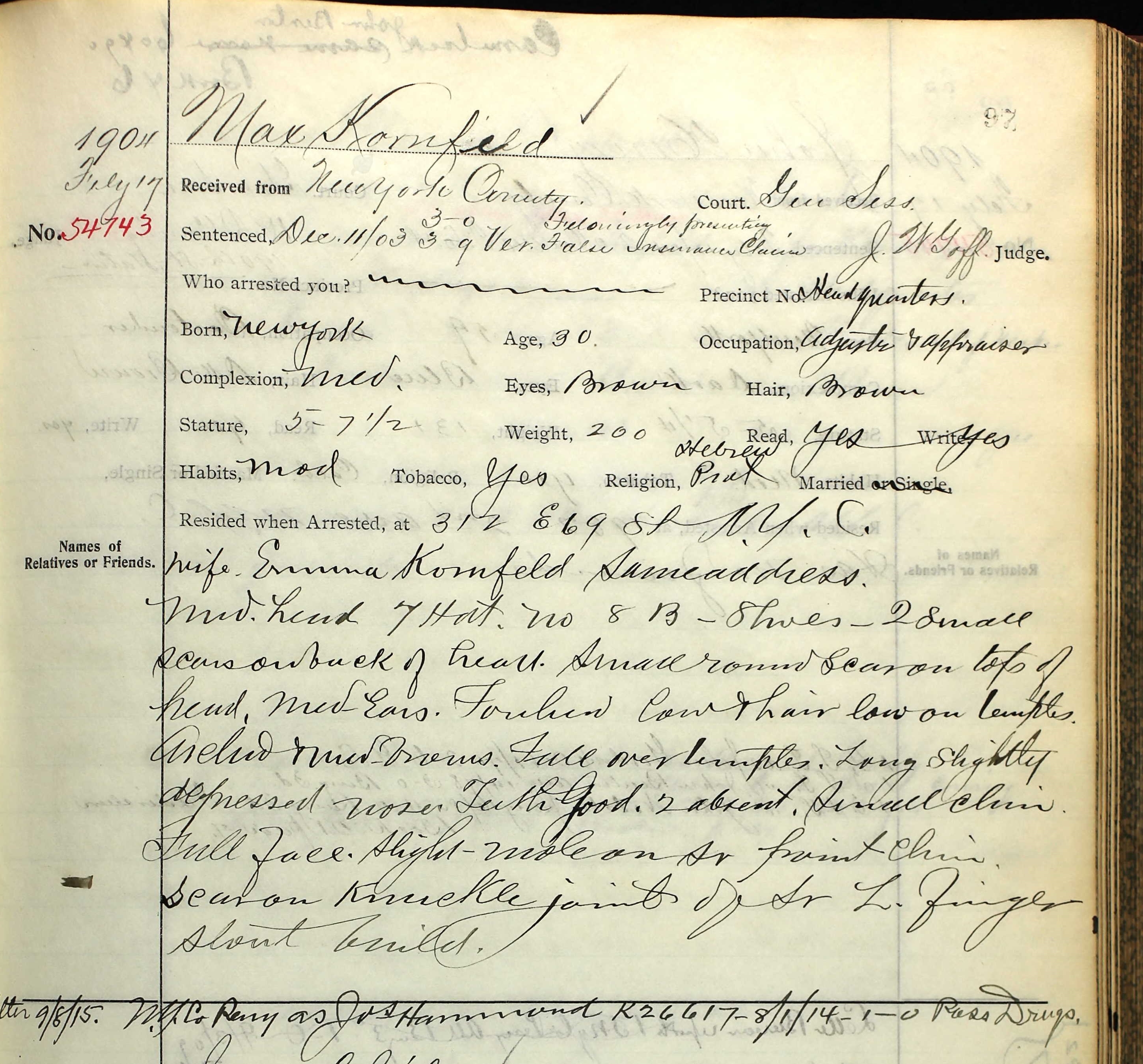 Max was admitted to Sing Sing prison on July 17, 1904, and according to the admission record below, it looks like he was sentenced for three to nine years;  he was still in prison at the time of the 1905 New York State census.  One thing I found interesting on the Sing Sing admission record is the recording of his religion as Protestant and Hebrew.  There is also a detailed physical description; Max had a number of scars on his head as well as on his hand.