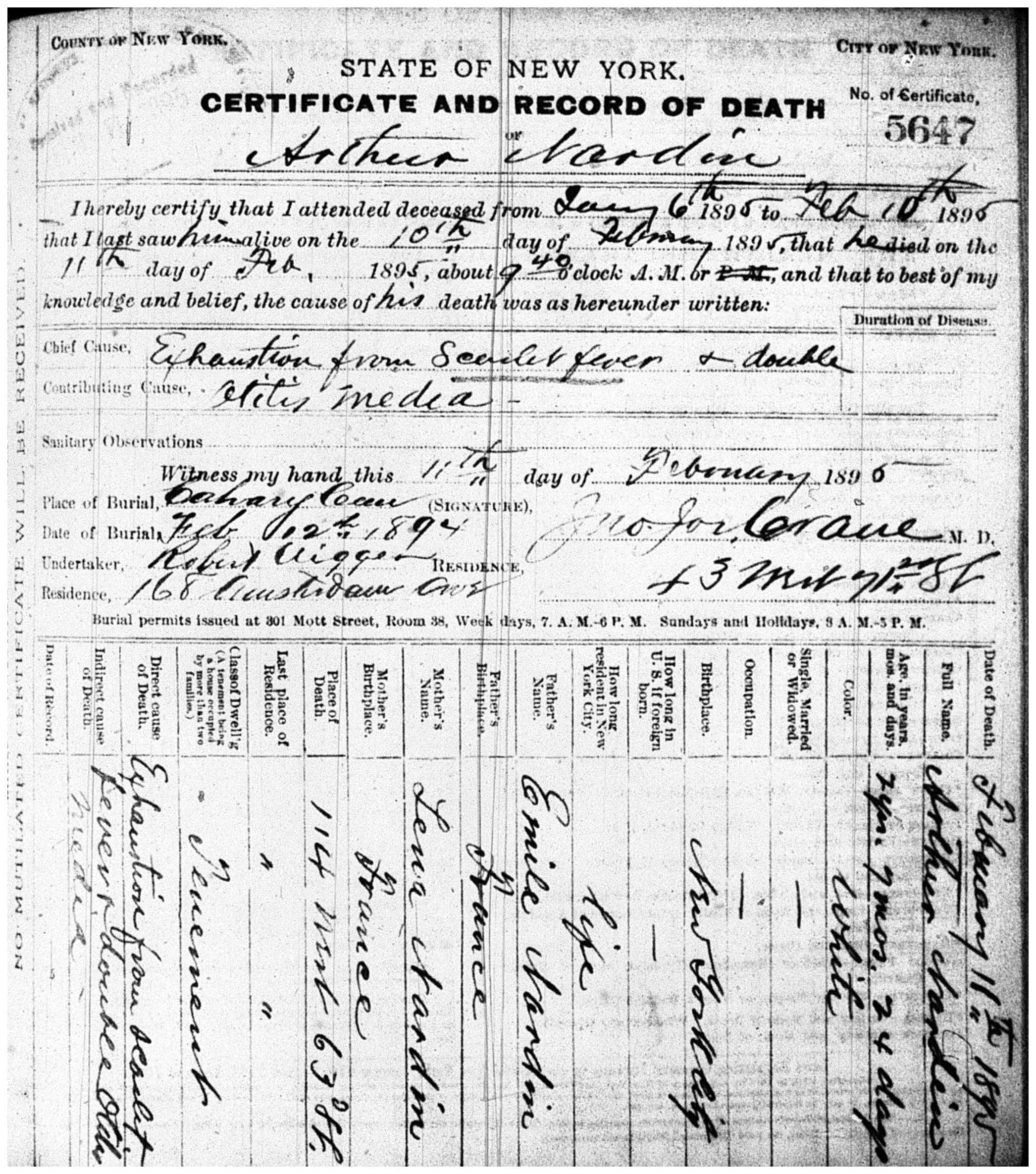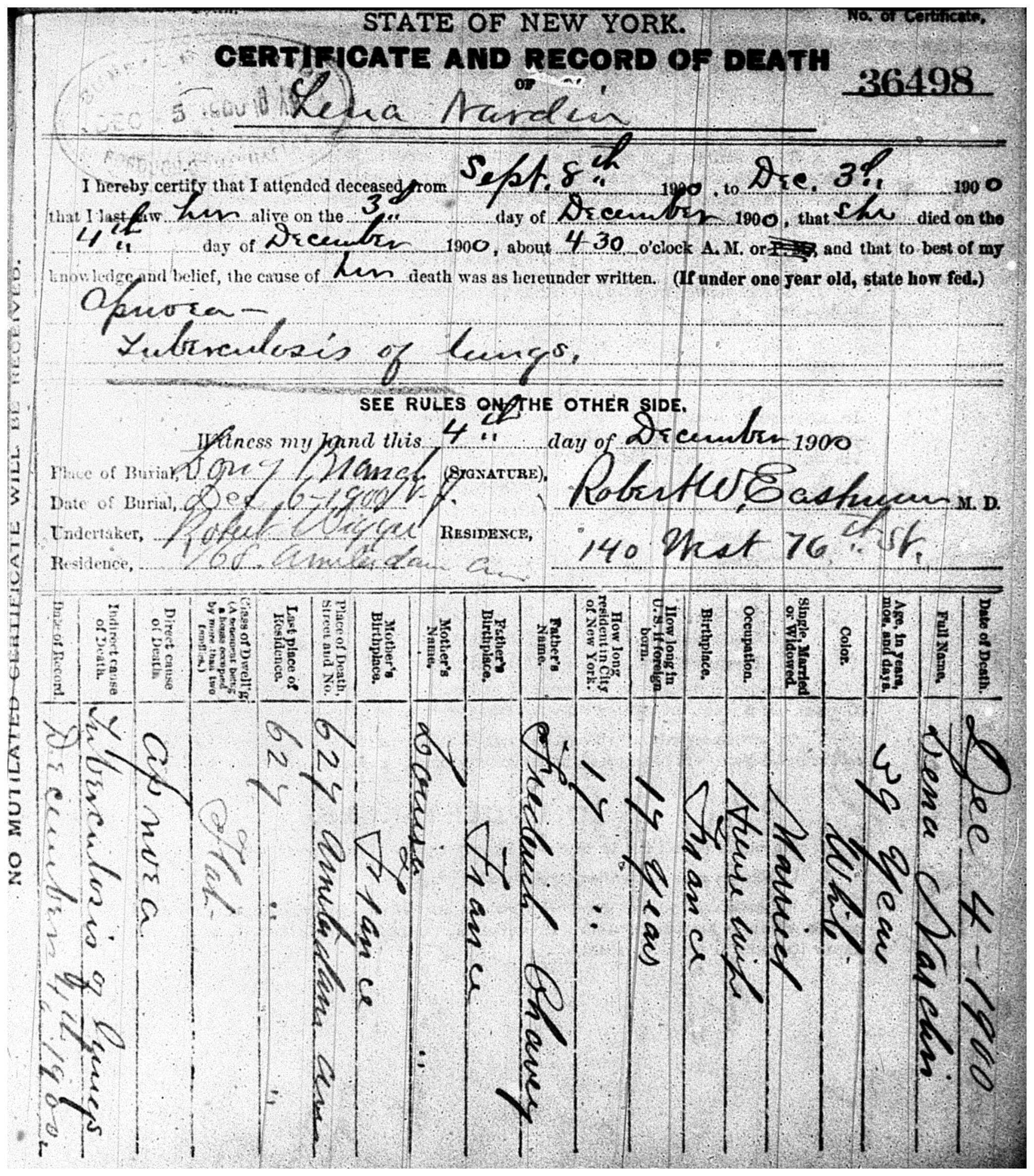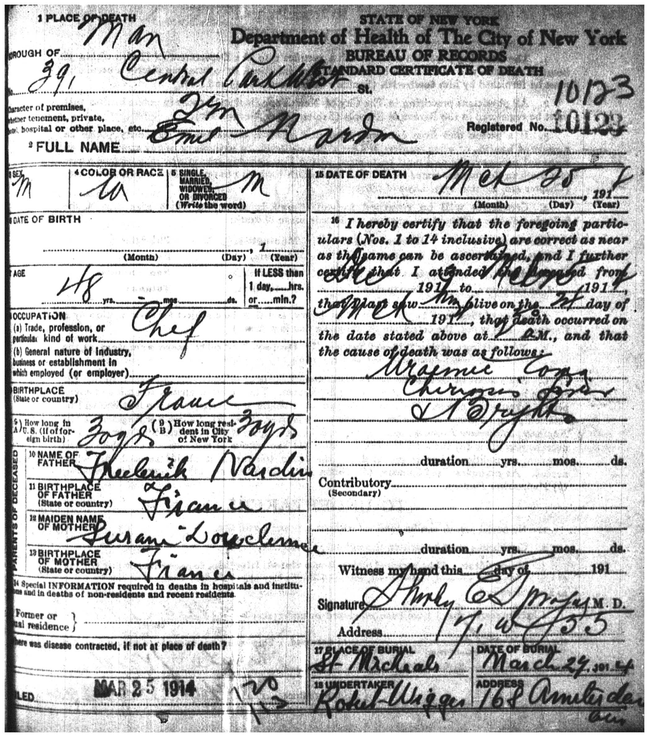 Emil was born in France, the son of Fredric and Susanne Nardin, and had arrived in the US in about 1886 when he was about twenty years old.   He had been married previously to Lena Chavey, also French born, and they had had three children together: Ida, born in 1888, whom I cannot find on any subsequent record, Henri Arthur, who was born in 1892 and who died in 1895 from scarlet fever, and Helen Edith (known as Edith), born in 1896. On the 1900 census, Emil and Lena were living with just Edith.  The census record reported that although Lena had had three children, only one was alive, so Ida must have died also.  Emil was working as a cook. (A French chef in the family!)  The family was living at 627 Amsterdam Avenue in New York. Sadly, Emil’s first wife Lena died from tuberculosis on December 4, 1900, leaving him with four year old Edith.  Lena was 39 years old.