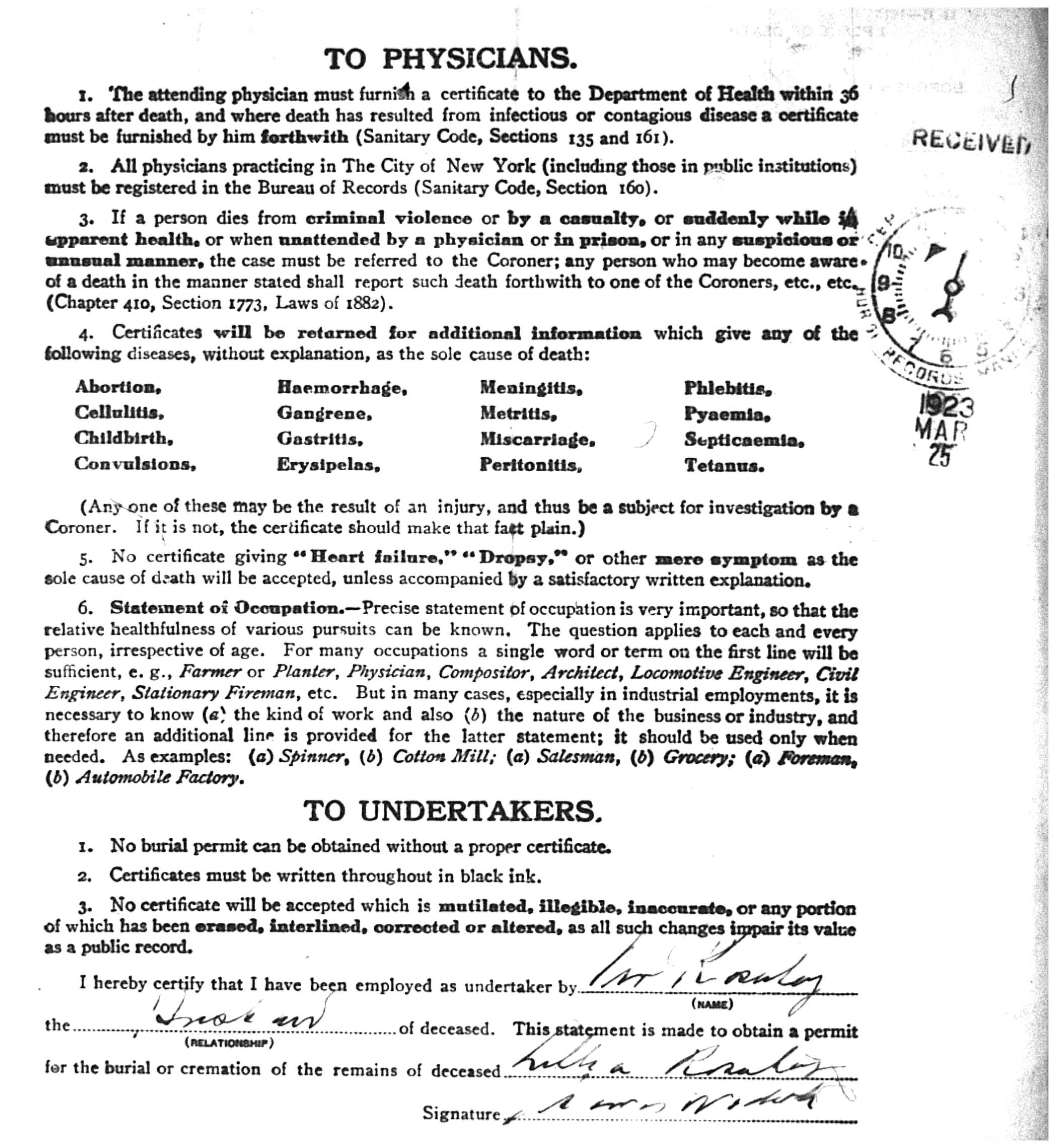 Two years later Mary’s youngest child, Lillian Kornfeld Nardin Rosenberg, died at age 41.  (Her death certificate says she was 39, born in 1884, but that is not consistent with the birth records from the NYC birth index I have for her.)  She died from chronic endocarditis and cerebral edema.