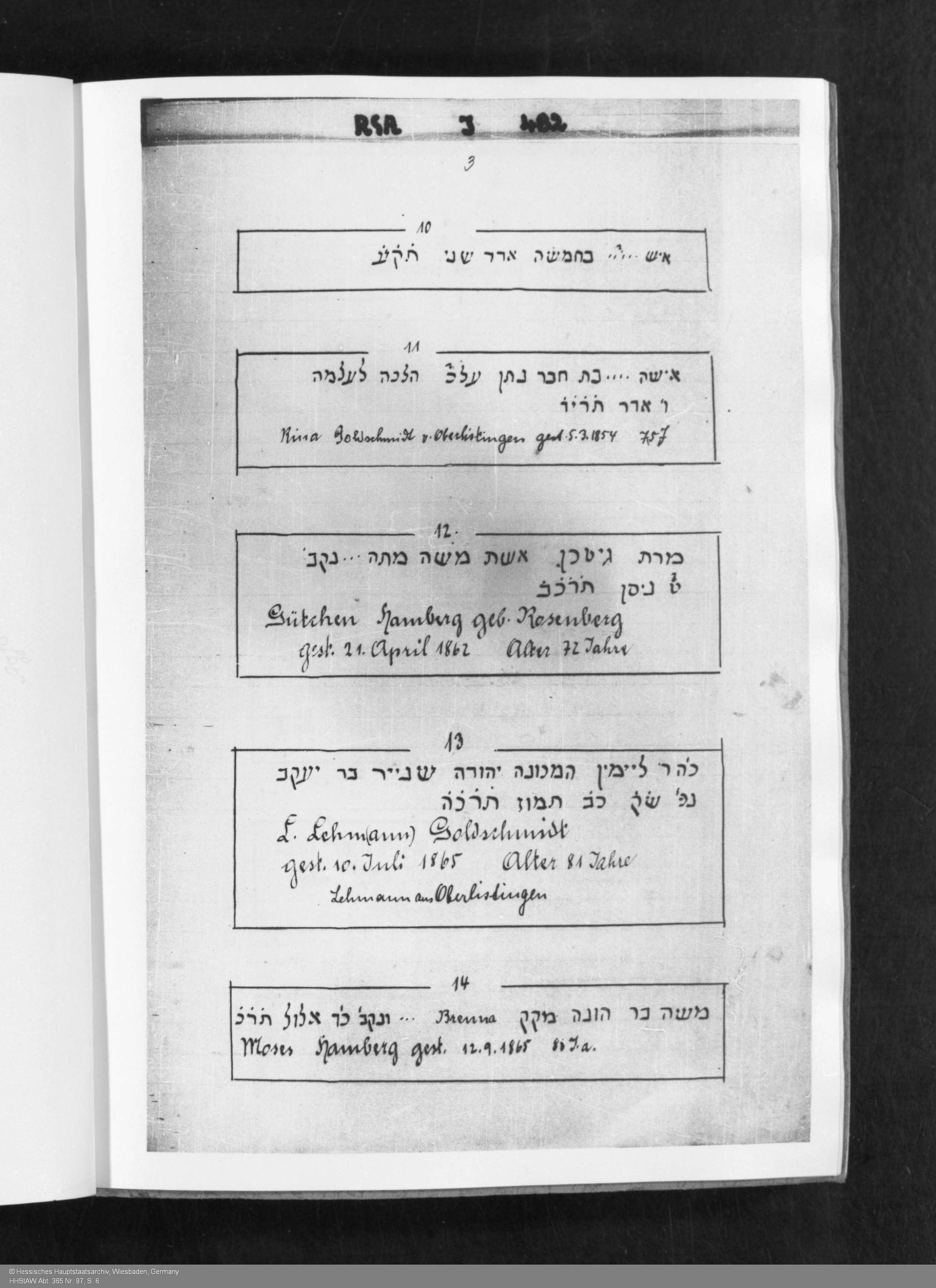 Headstone inscription for Guetchen Rosenberg Hamberg (12) and Moses Hamberg HHStAW Abt. 365 Nr. 97, S. 6