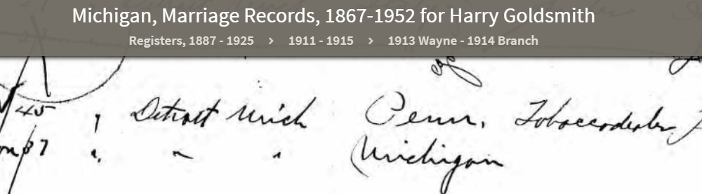 But then I found a marriage record for a Harry Goldsmith, born in Pennsylvania, whose parents were named Jacob and Fanny. The marriage took place in Detroit, Michigan, on December 16, 1913. The groom was 45 years old, meaning born around 1868, ten years after my Harry Goldsmith was born. He was a tobacco dealer. His bride was Henrietta Robinson, who was 37 years old and born in Michigan. It was a second marriage for Harry, a first for Henrietta.