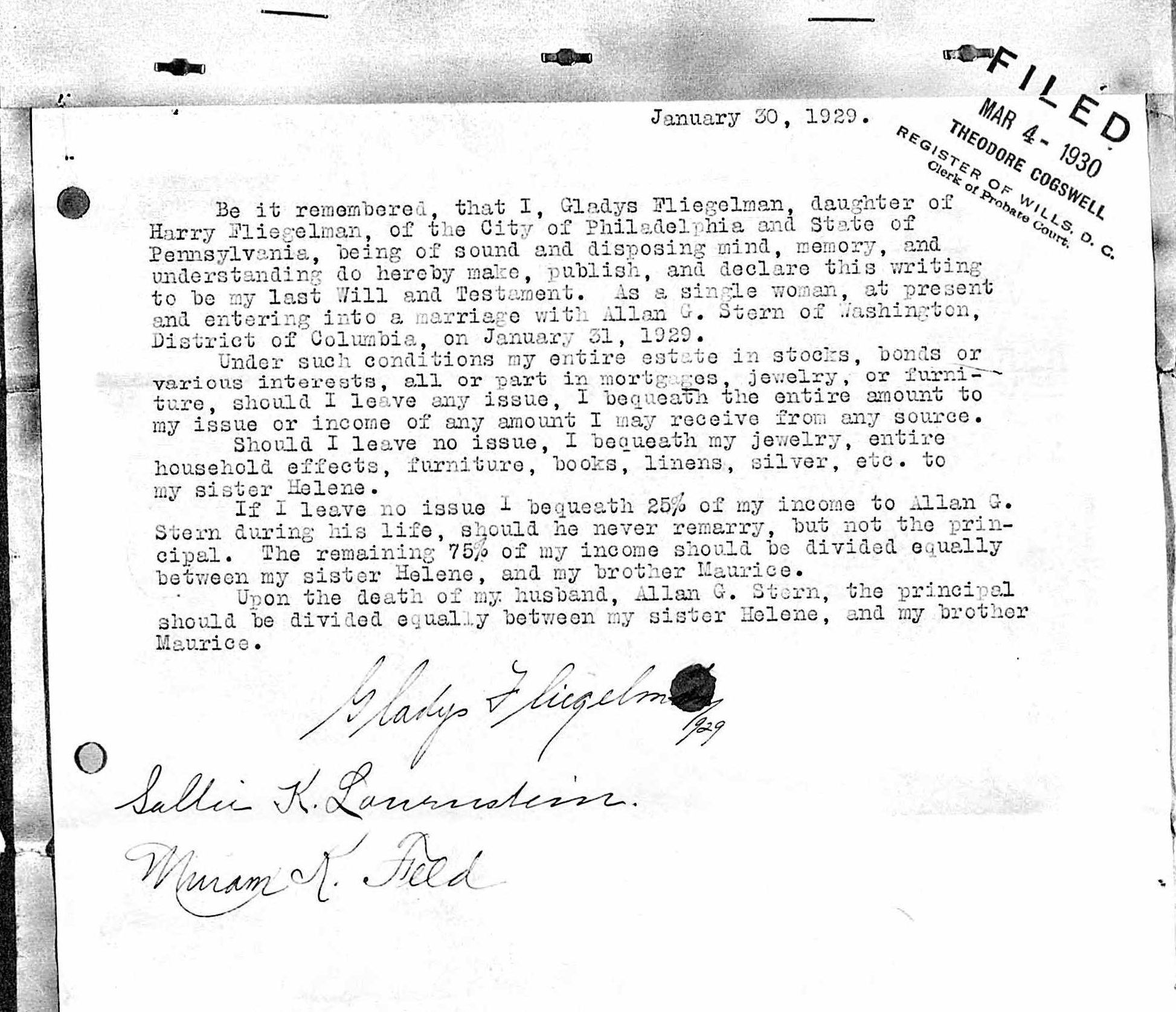 Gladys Fliegelman Stern will