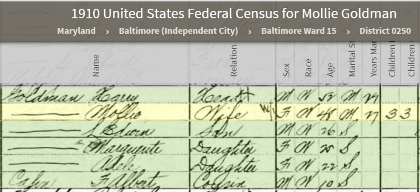 Harry Goldman and family, 1910 US census, Census Place: Baltimore Ward 15, Baltimore (Independent City), Maryland; Roll: T624_558; Page: 5A; Enumeration District: 0250; FHL microfilm: 1374571