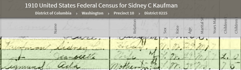 Sydney Kaufman and family, 1910 US census, Census Place: Precinct 10, Washington, District of Columbia; Roll: T624_155; Page: 8A; Enumeration District: 0215; FHL microfilm: 1374168