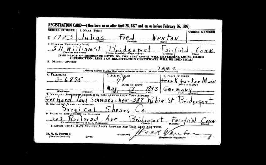 Julius Wenten, World War II draft registration, The National Archives at St. Louis; St. Louis, Missouri; World War II Draft Cards (Fourth Registration) for the State of Connecticut; Record Group Title: Records of the Selective Service System; Record Group Number: 147; Series Number: M1962