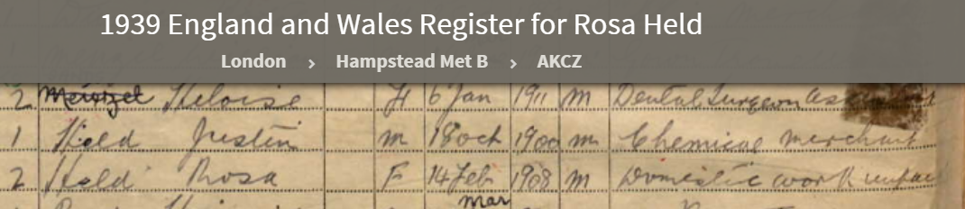 And those children were all over the world by then. Rosa Loewenthal and Justin Held and their children left for England in 1939 and then immigrated to the United States in 1940.5 They ended up living in New York and becoming naturalized citizens.6 Justin died in 1980,7 Rosa in 1993.8