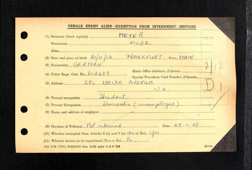 Hilde Meyer, The National Archives; Kew, London, England; HO 396 WW2 Internees (Aliens) Index Cards 1939-1947; Reference Number: HO 396/61