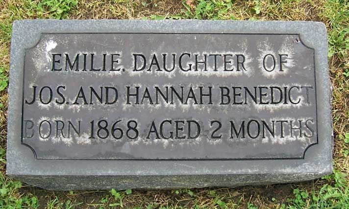 Find a Grave, database and images (https://www.findagrave.com : accessed 06 June 2020), memorial page for Emilie Benedict (Oct 1868–Dec 1868), Find a Grave Memorial no. 109102550, citing Troy Hill Jewish Cemetery, Pittsburgh, Allegheny County, Pennsylvania, USA ; Maintained by Corey & Douglas Marshall-Steele (contributor 47477063) .