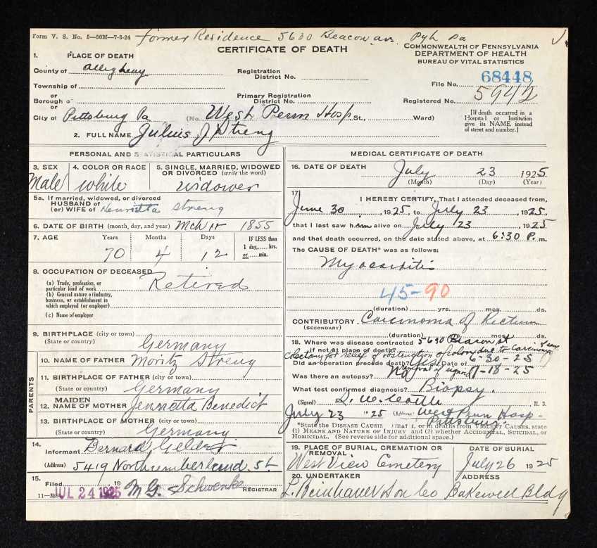 Julius Streng death cert