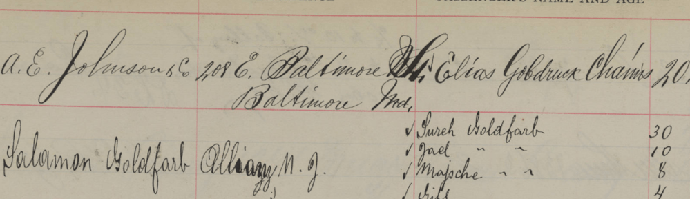 The manifest indicated that they were headed to Philadelphia, that their prior residence was Grembow, “Austria” (now Poland), and that her husband Schmuel Goldfarb had paid their fare.