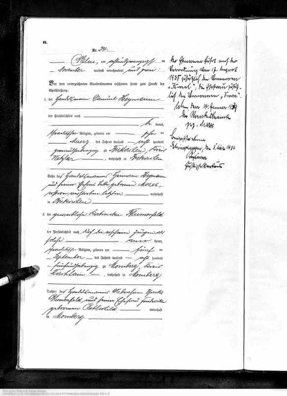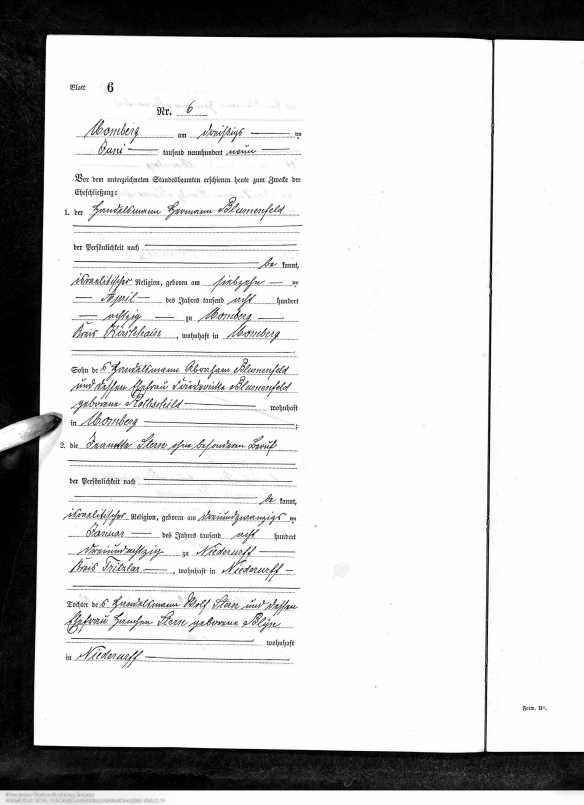 Marriage of Hermann Blumenfeld and Jeannette Stern, Hessisches Hauptstaatsarchiv; Wiesbaden, Deutschland; Bestand: 915; Laufende Nummer: 6194, Year Range: 1909, Ancestry.com. Hesse, Germany, Marriages, 1849-1930