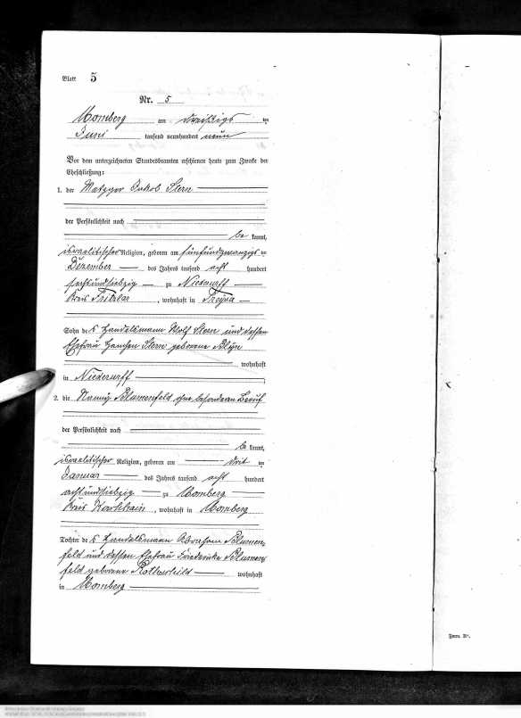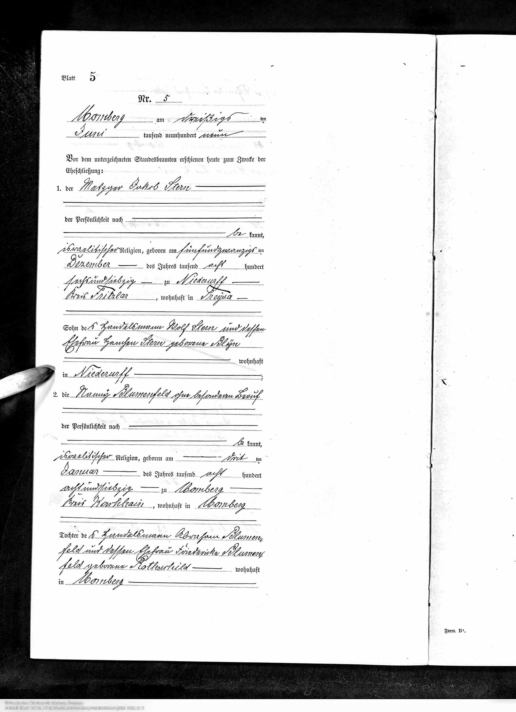 Marriage record of Auguste Blumenfeld and Menko Stern, Hessisches Hauptstaatsarchiv; Wiesbaden, Deutschland; Bestand: 920; Laufende Nummer: 8009, Year Range: 1900, Ancestry.com. Hesse, Germany, Marriages, 1849-1930