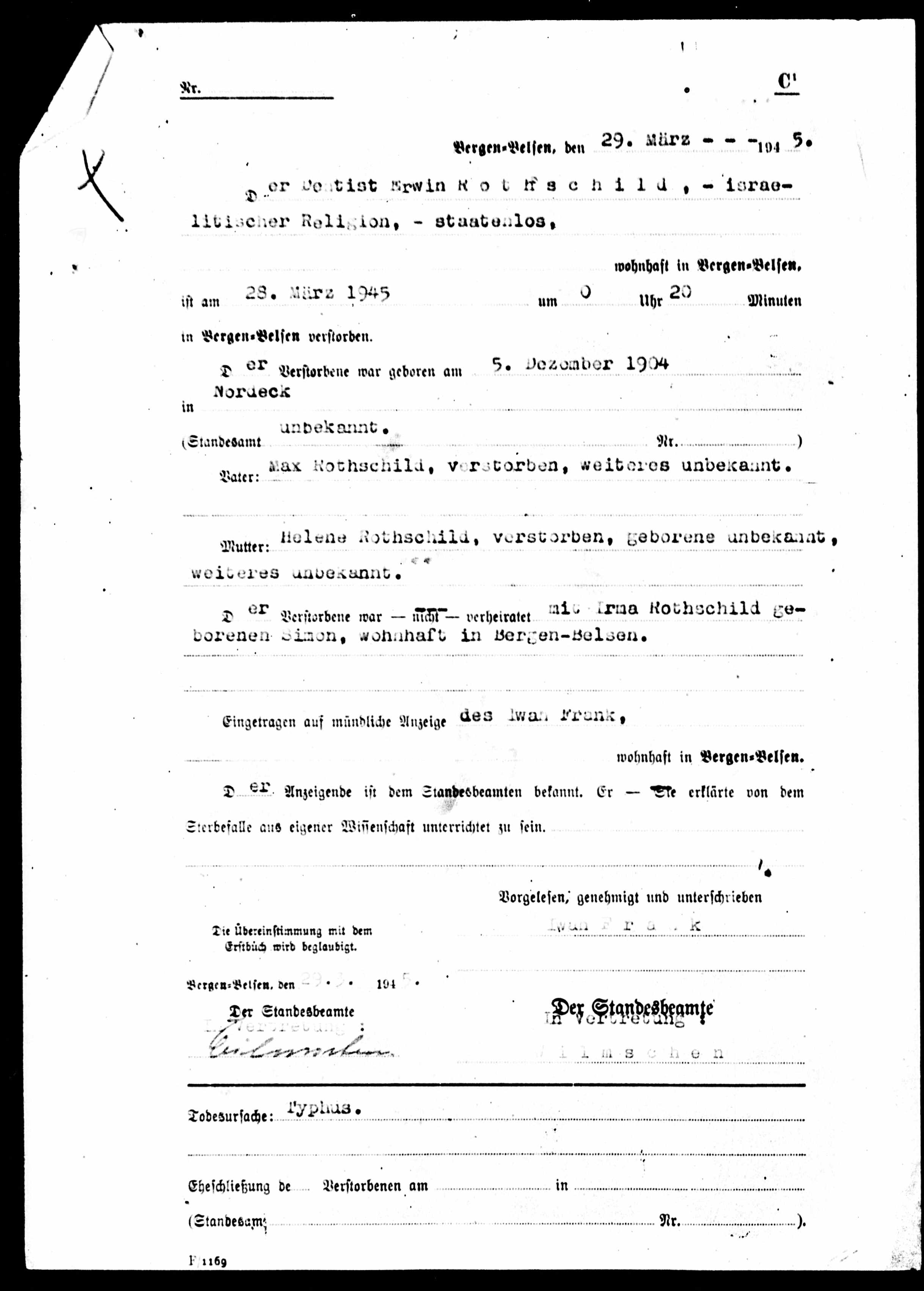 Erwin Rothschild death record from the Bergen Belsen Concentration Camp, The National Archives at College Park; College Park, Maryland; Microfilm: A3355; ARC: 596972; Title: Lists and Registers of German Concentration Camp Inmates, 1946 – 1958; Record Group: 242; Record Group Title: National Archives Collection of Foreign Records Seized, 1675 – 1958