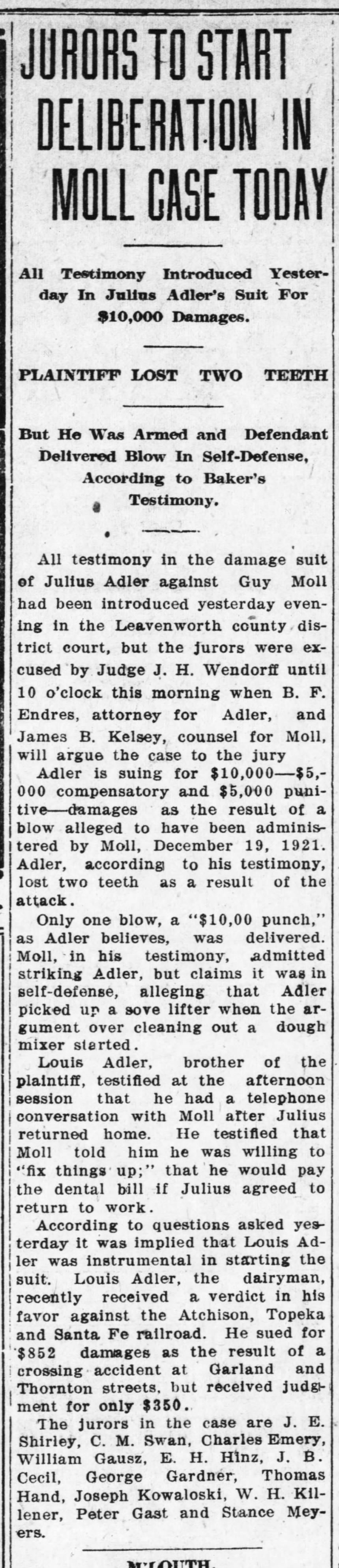 “Jurors to Start Deliberations in Moll Case Today,” The Leavenworth (KS) Times, February 18, 1922, p. 10