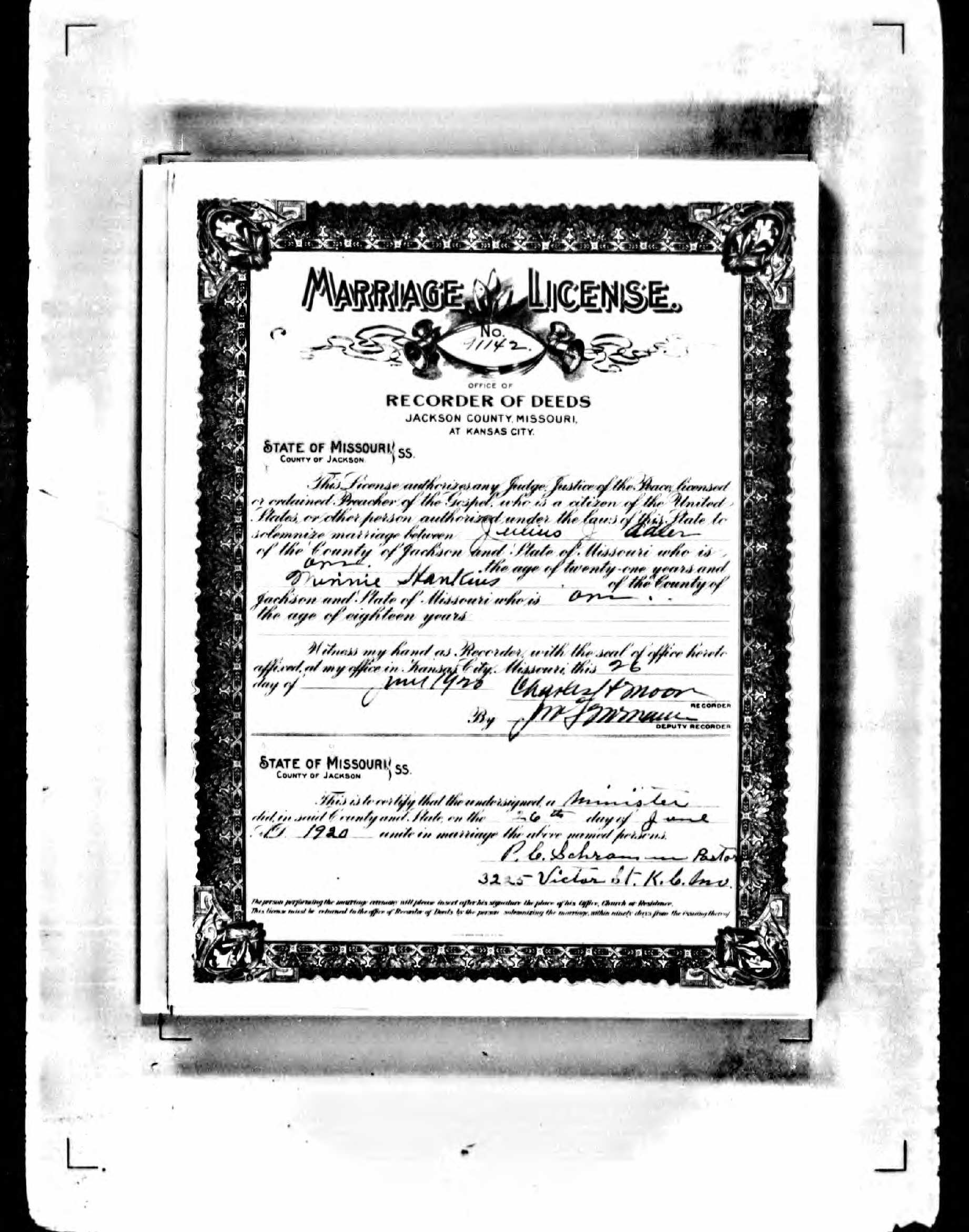 On June 26, 1920, not long after the enumeration of the 1920 census, Julius married his second wife, Minnie Hankins, in Kansas City, Missouri. Minnie was a Missouri native, born on June 18, 1897, to Charles Love Hankins and Martha Meirhaftz.1