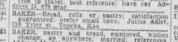 In 1927 Julius and Minnie were listed in the Topeka, Kansas, city directory, and Julius was again working in a bakery.7 But he ran a “situation wanted” ad that year seeking a bakery job “preferably in a small town.”