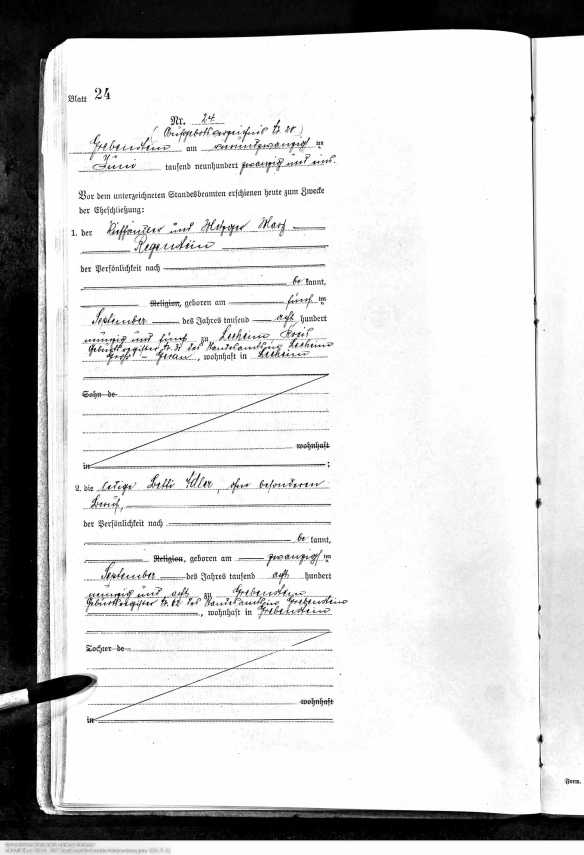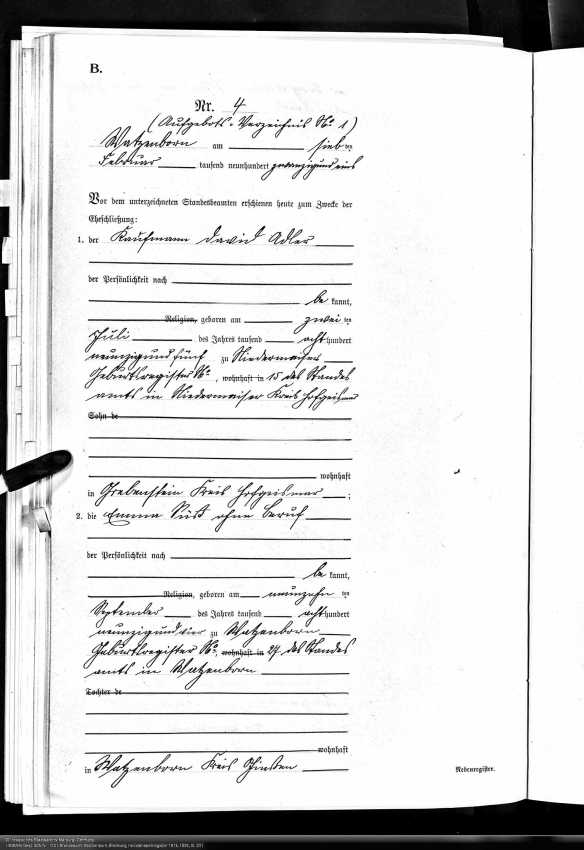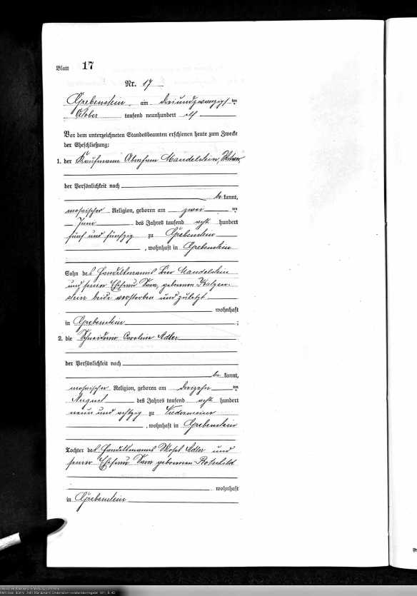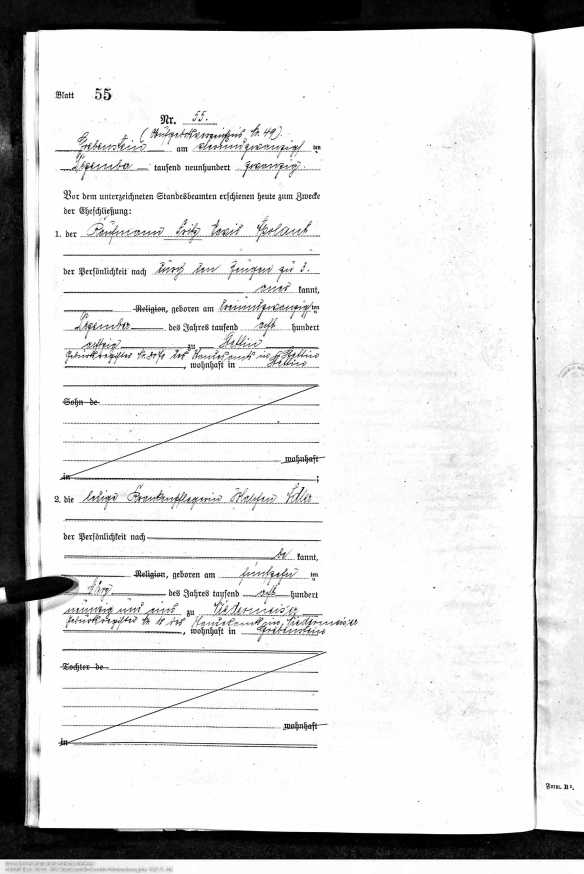 Caroline Adler and Albert Mandelstein marriage record, Hessisches Hauptstaatsarchiv; Wiesbaden, Deutschland; Signatur: 2997, Year Range: 1911, Ancestry.com. Hesse, Germany, Marriages, 1849-1930