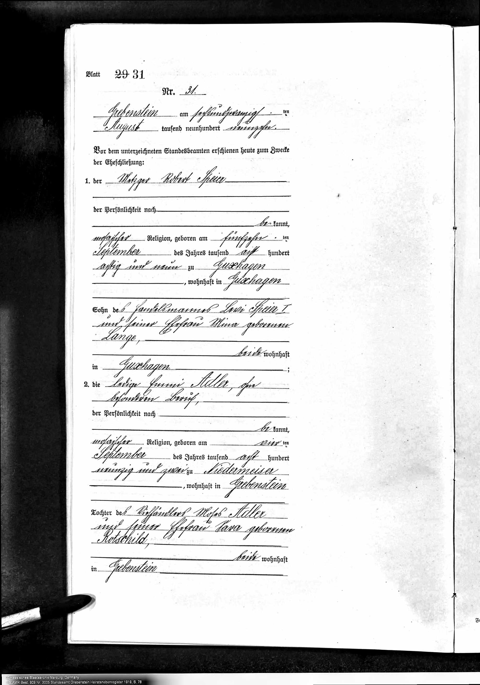 Emmi Adler and Robert Speier marriage record, Hessisches Hauptstaatsarchiv; Wiesbaden, Deutschland; Signatur: 3005, Year Range: 1919, Ancestry.com. Hesse, Germany, Marriages, 1849-1930