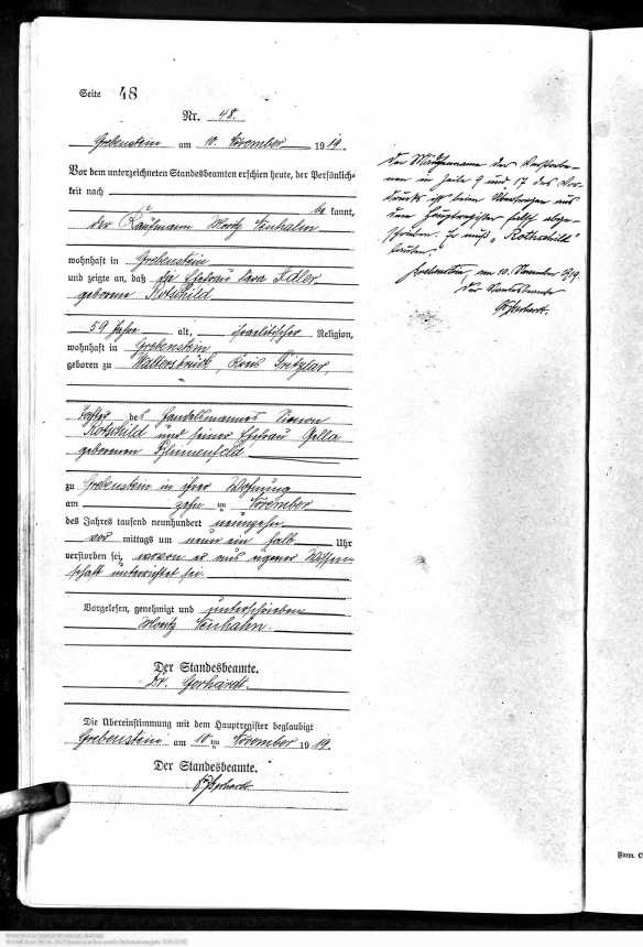 Sara Rothschild Adler death record, Hessisches Hauptstaatsarchiv; Wiesbaden, Deutschland; Personenstandsregister Sterberegister; Signatur: 3065; Laufende Nummer: 909, Year Range: 1919, Ancestry.com. Hesse, Germany, Deaths, 1851-1958