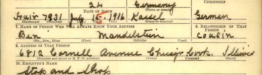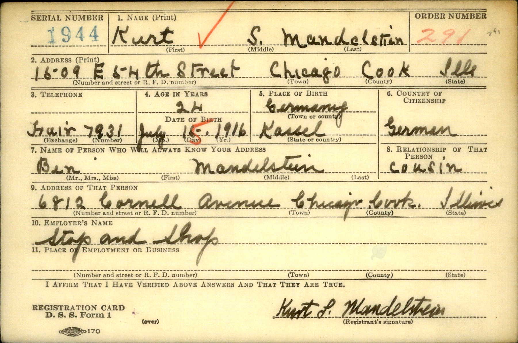 Kurt Mandelstein World War II draft registration, National Archives at St. Louis; St. Louis, Missouri; Wwii Draft Registration Cards For Illinois, 10/16/1940-03/31/1947; Record Group: Records of the Selective Service System, 147; Box: 1117, Ancestry.com. U.S., World War II Draft Cards Young Men, 1940-1947
