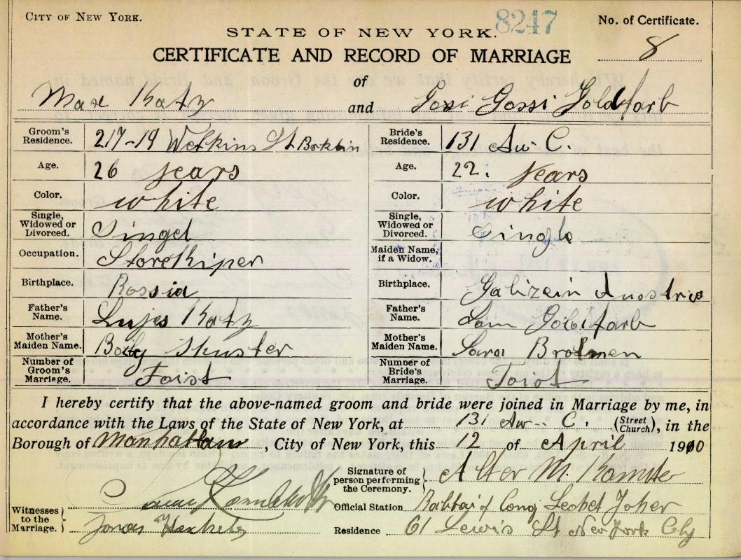 When I reexamined the marriage certificate I had for Gussie Goldfarb and Max Katz, a few things jumped out at me. One, Gussie was using her birth surname Goldfarb, not Gross, and two, she indicated that her marriage to Max was her first marriage.