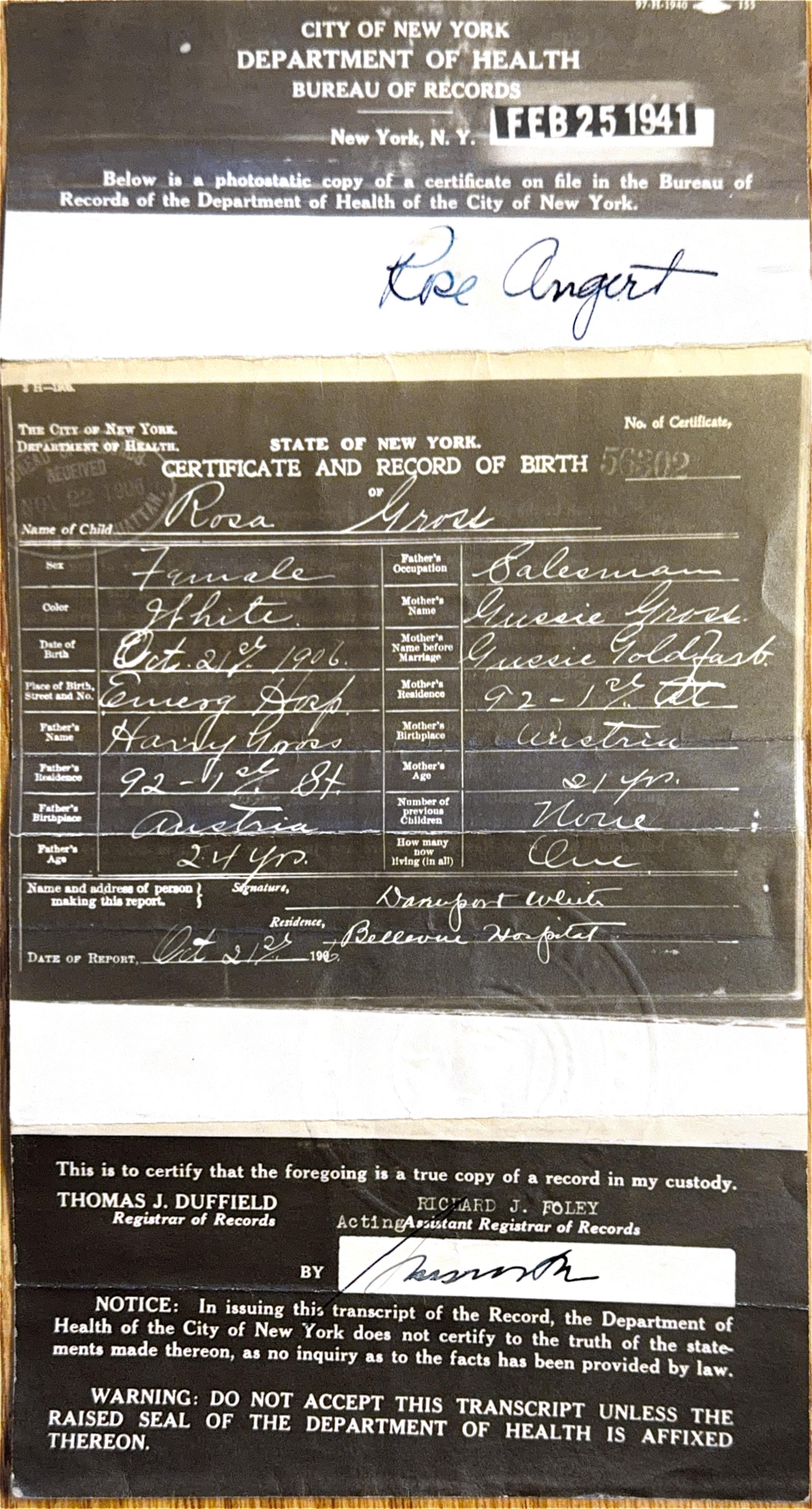 The birth record established that Gussie Goldfarb and Harry Gross were Rosa’s parents.