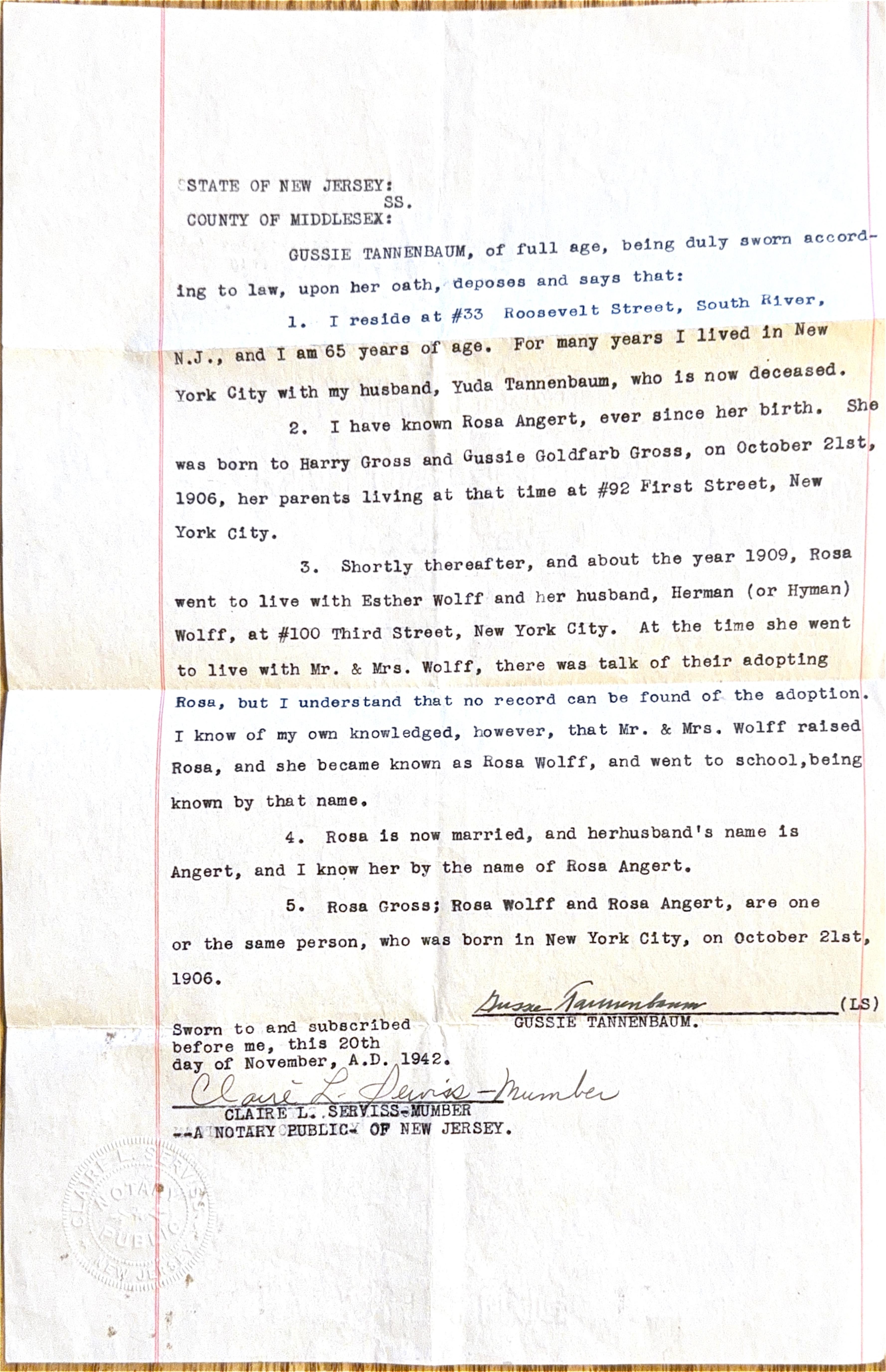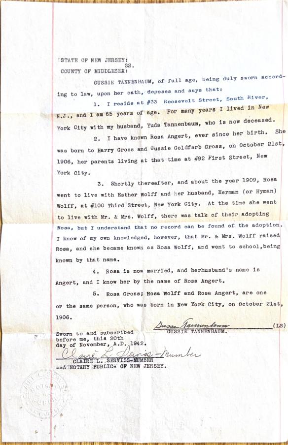 When I studied Ellen’s tree more carefully, I noticed that Ellen had indicated that Rosa had been adopted by another couple with the surname Wolff and that she had thereafter been known as Rosa Wolff, not Gross. Ellen shared this affidavit signed by a family friend in 1942 attesting to the fact that Rosa had been adopted (whether legally or not isn’t clear) by Esther and Herman Wolff in about 1909, the year before Gussie married Max Katz in 1910.