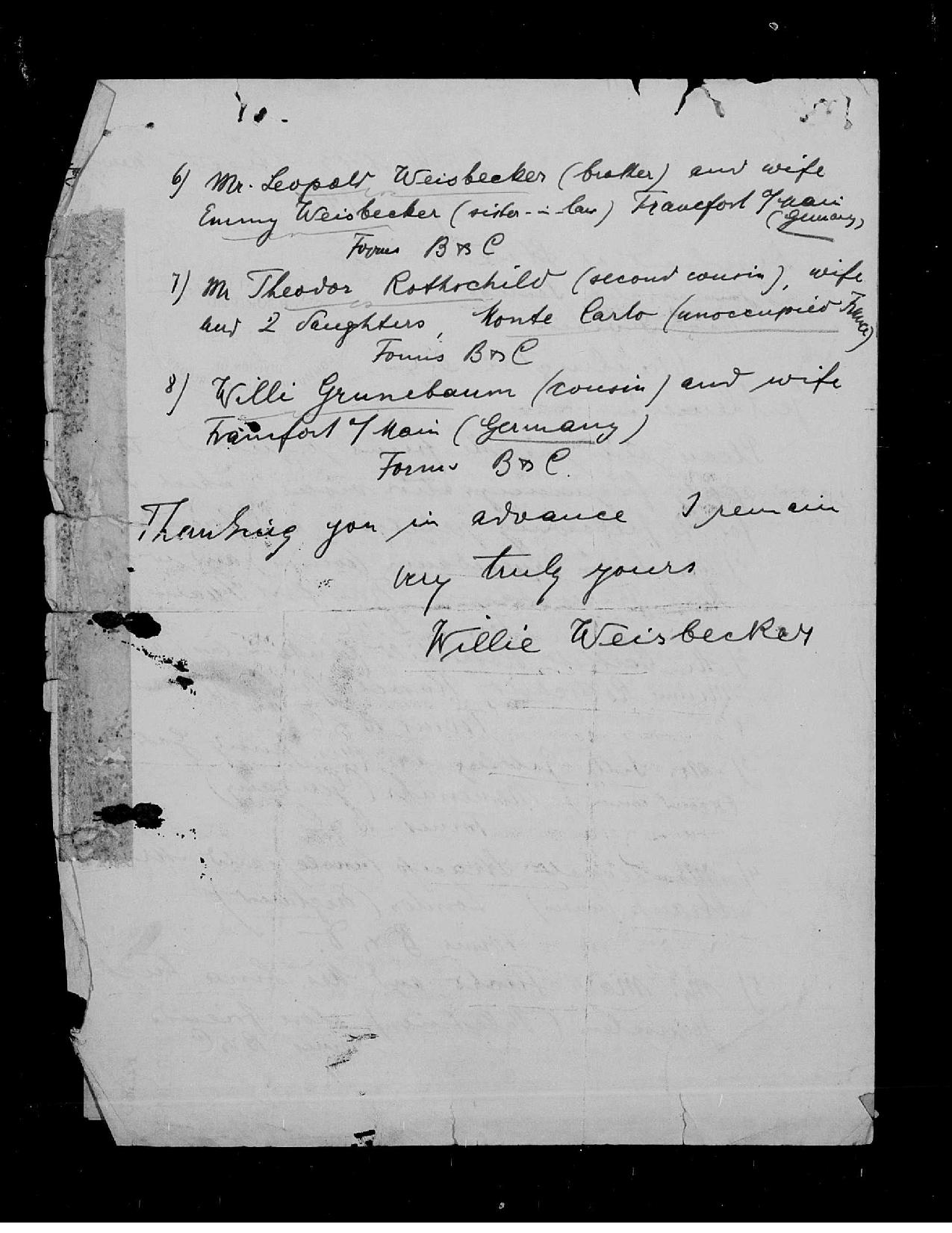 Although Theodore was described as a second cousin to Willie, Berthold was described as his brother-in-law. I have no record of Theodor’s brother Berthold being married to a woman named Minna, though we know that his first wife Sarah had died in 1937. I thus am not sure that the Berthold Rothschild listed was the same person as Theodor’s older brother Berthold. I did find a tree on JewishGen with a different Berthold Rothschild married to a woman named Minna Weisbecker, so assuming that is accurate, the Berthold Rothschild in Willie’s letter is not my relative.