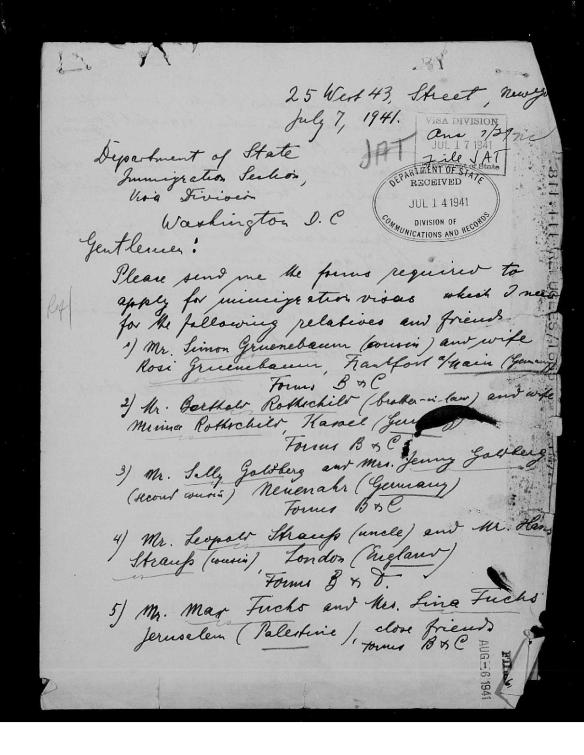 By doing a full-text search on FamilySearch, I found a letter written by someone named Willie Weisbecker to the US State Department on July 7, 1941, requesting the appropriate forms to apply for visas for eight different families. Theodore Rothschild and his wife and daughters were one of the listed families (#7), as was someone named  Berthold Rothschild and his wife Minna (#2). I learned that Willie Weisbecker was a German-born immigrant to the US who was an attorney and active in helping former German Jews recover compensation for property that was confiscated by the Nazis.2