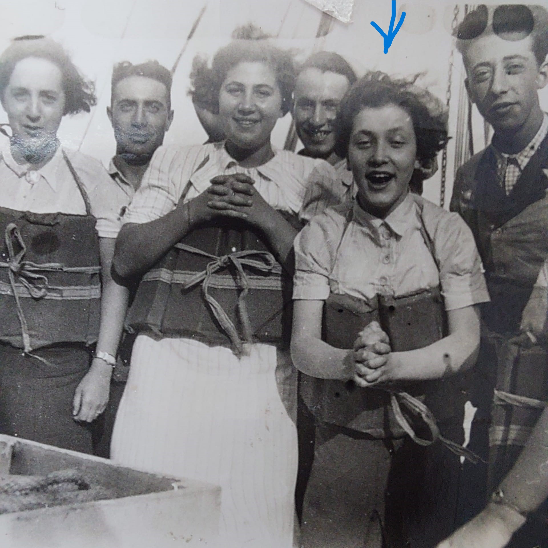 Sarah’s daughter Helene (later known Hana in Israel) bore a striking resemblance to her mother. She left Israel in 1937, the same year her mother died, and immigrated to what was then Palestine. This photograph of her on the ship to Palestine is my favorite in this collection. It shows her youthful innocence and excitement. She was only fifteen and traveling without her family. The blue arrow points to Helene.