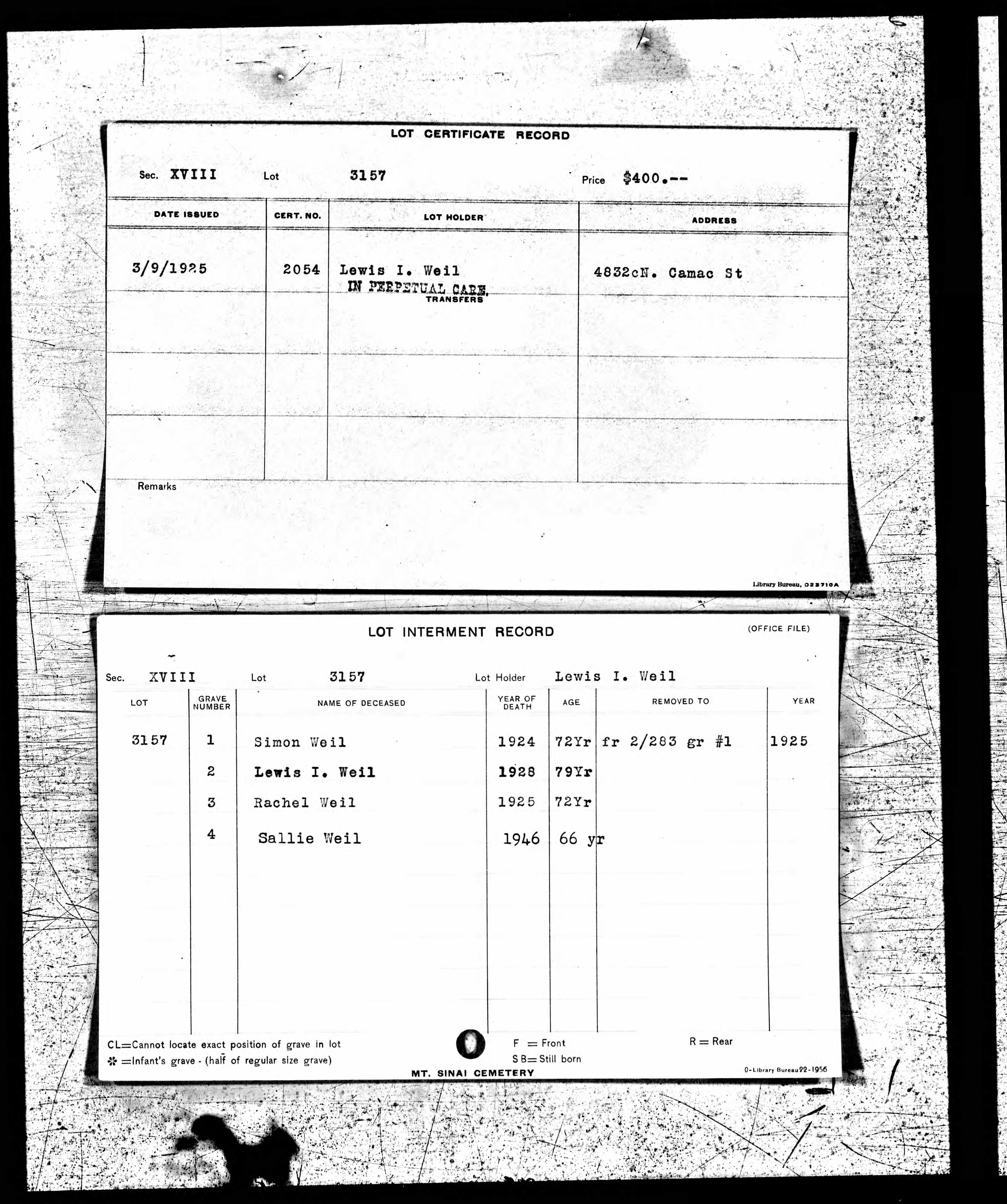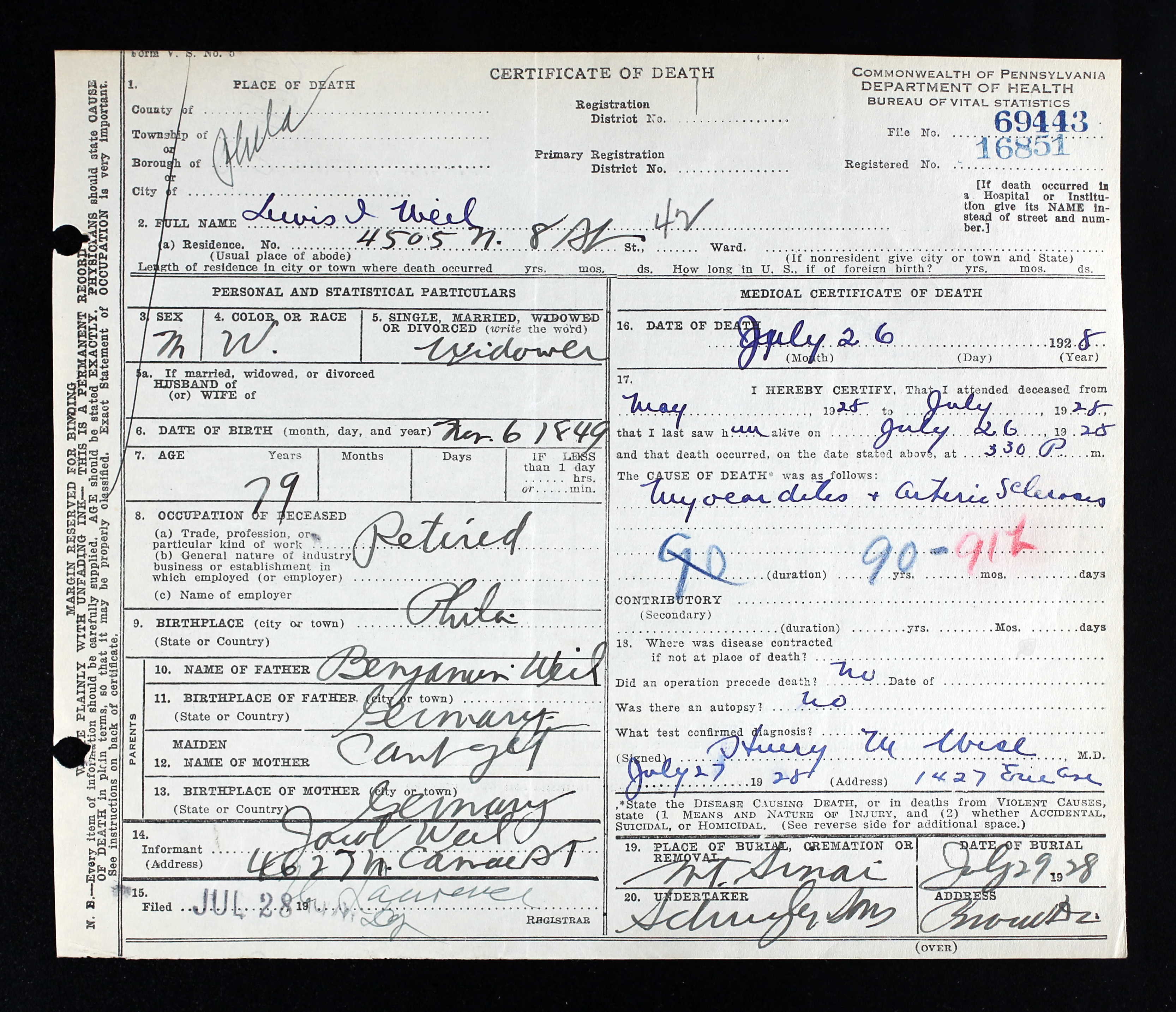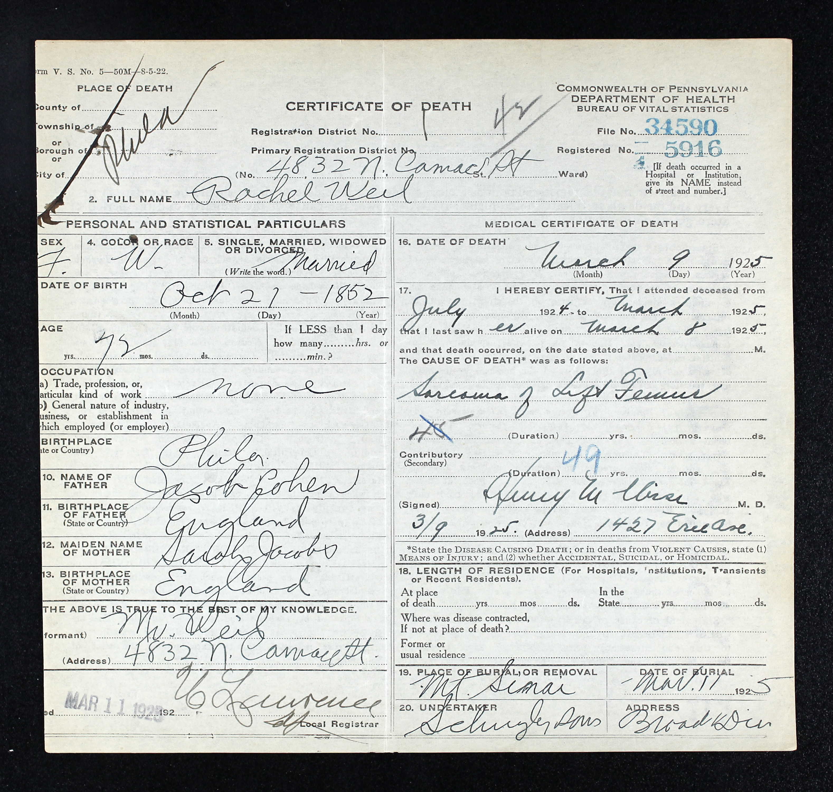Rachel and Lewis Weil’s daughter Irene had married James Doran in 1915. They had a long marriage, living in Philadelphia for almost twenty years before moving to Camden, New Jersey in the 1930s where they lived for at least another ten years. I have not found any records for either of them after 1945, except for a record of Irene’s death on April 8, 1977 in Erie, Pennsylvania, on the Social Security Death Index. Both Irene and James were buried at West Laurel Hill cemetery in Bala Cynwyd, Pennsylvania, but no dates are recorded for James, so I am not sure when he died. They left no descendants.