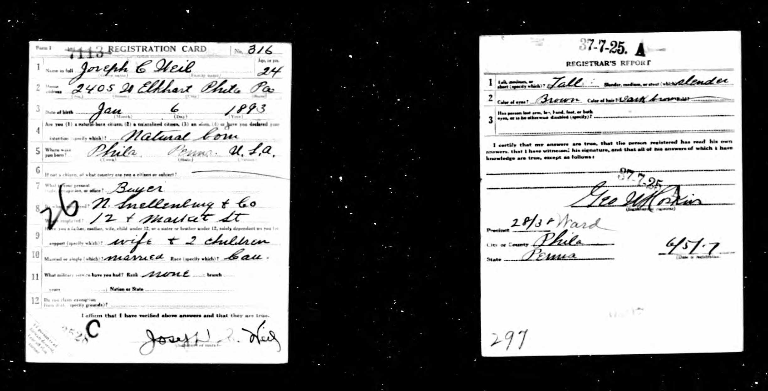 By 1917, however, Joseph was living back in Philadelphia, according to his World War I draft registration. The registration also says that Joseph was married with two children, living at 2405 South Elkhart Street, and working as a buyer at N. Snellenburg and Company. Joseph’s uncle, Joseph Cohen (Rachel’s brother) had married Caroline Snellenburg, so I imagine that this was a store owned by his uncle’s father-in-law’s family.