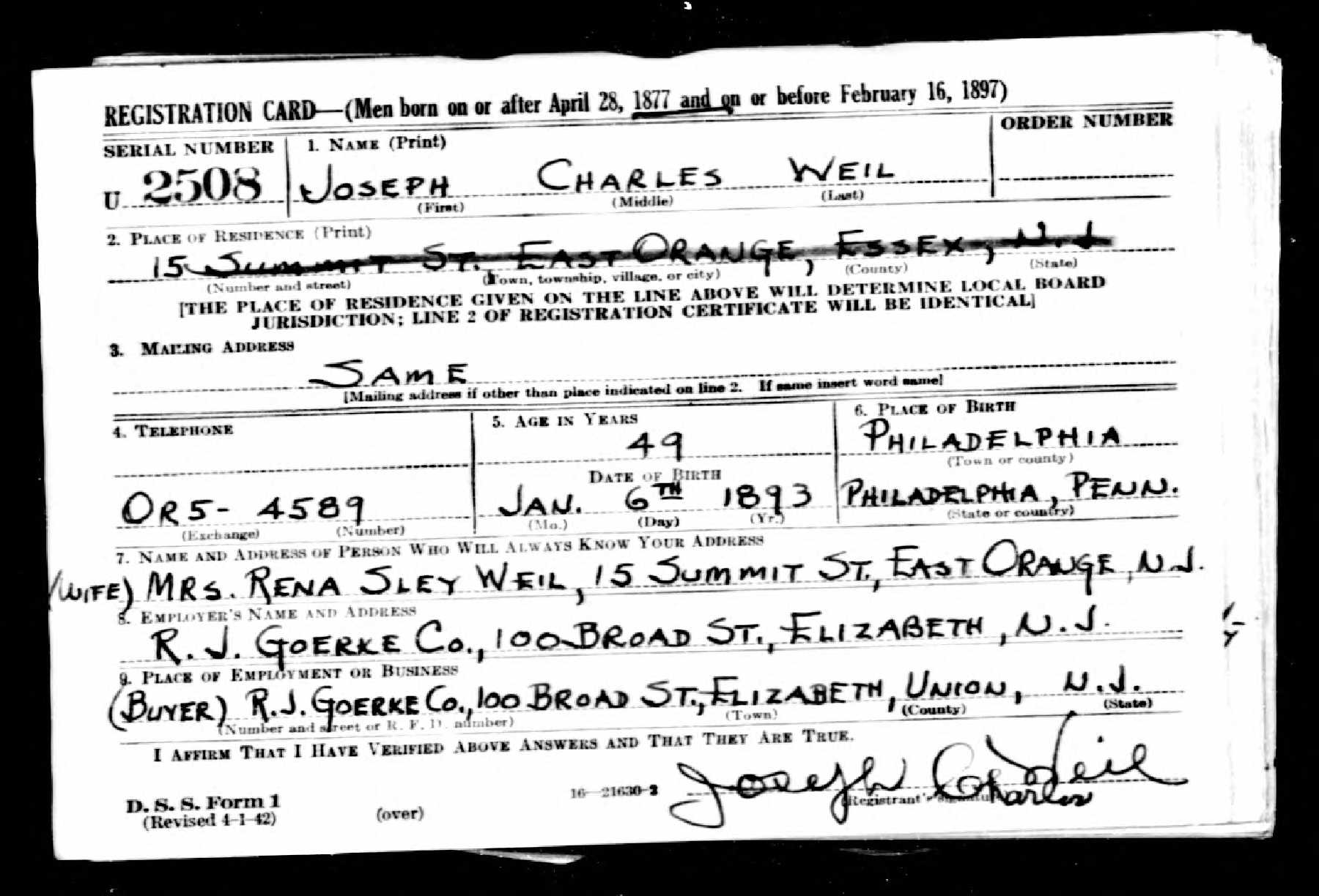 Joseph, meanwhile, had also remarried by then. He had married Rose “Rena” Sley in 1921. On the 1930 census, he was living with Rena, and their daughter Geraldine, who was then seven years old. Joseph was selling men’s shirts. In 1935, they were living in Hackensack, New Jersey, and in 1940 in Irvington, New Jersey. Two cousins were living with them as well. Joseph was a buyer at a department store; according to his World War II draft registration, he was working for R.J. Goerke Company in Elizabeth, New Jersey, and living in East Orange in 1942.
