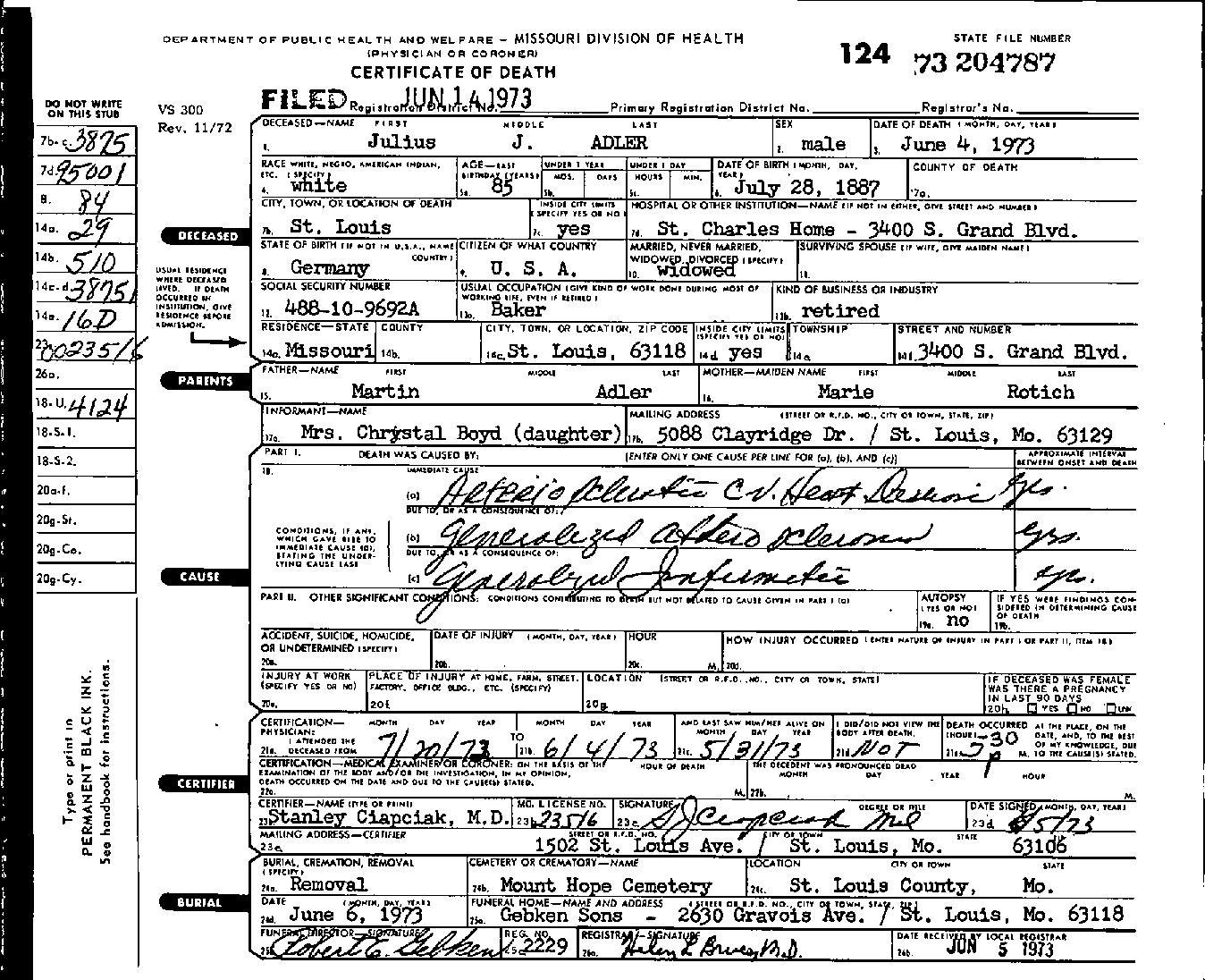 Julius Adler death certificate, found at https://www.sos.mo.gov/images/archives/deathcerts/1973/1973_00204787.PDF