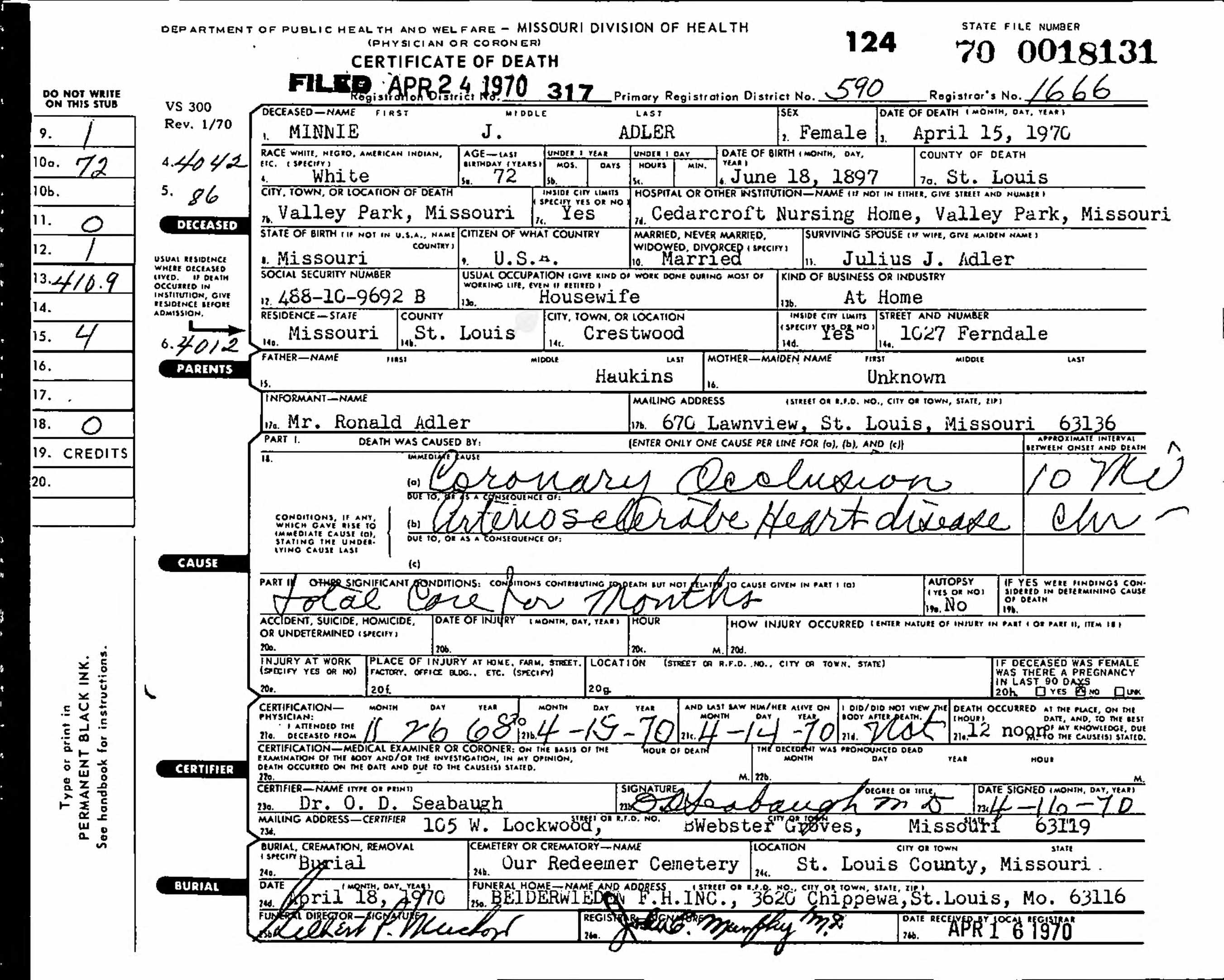Minnie Hankins Adler, second wife of Julius Adler from whom he appears to have been separated for many years, died on April 15, 1970, in St. Louis; she is buried at Our Redeemer Cemetery in St. Louis.3 Notice that her death certificate lists Julius Adler as her surviving spouse, but her informant was her adopted son Ronald Adler.