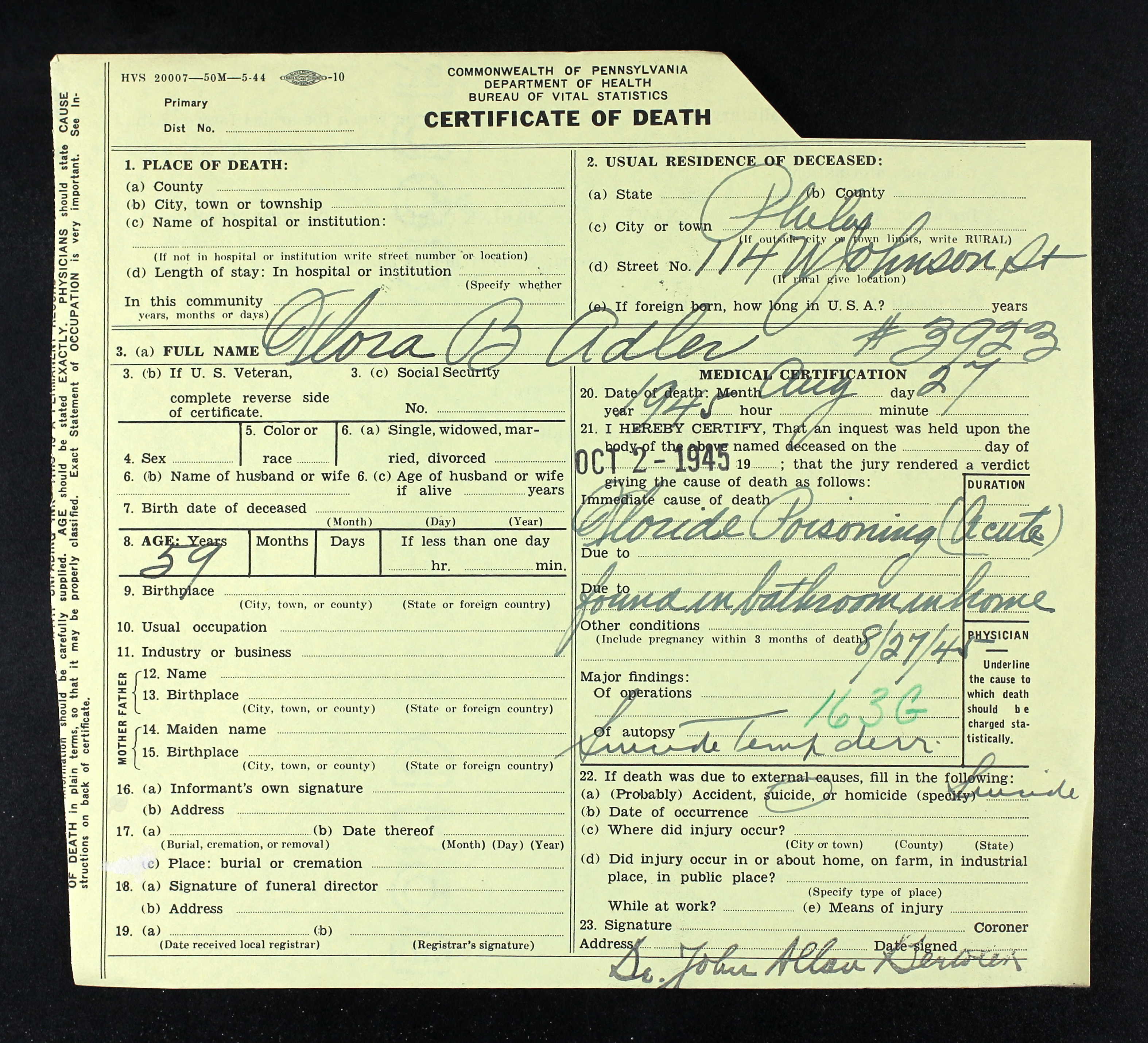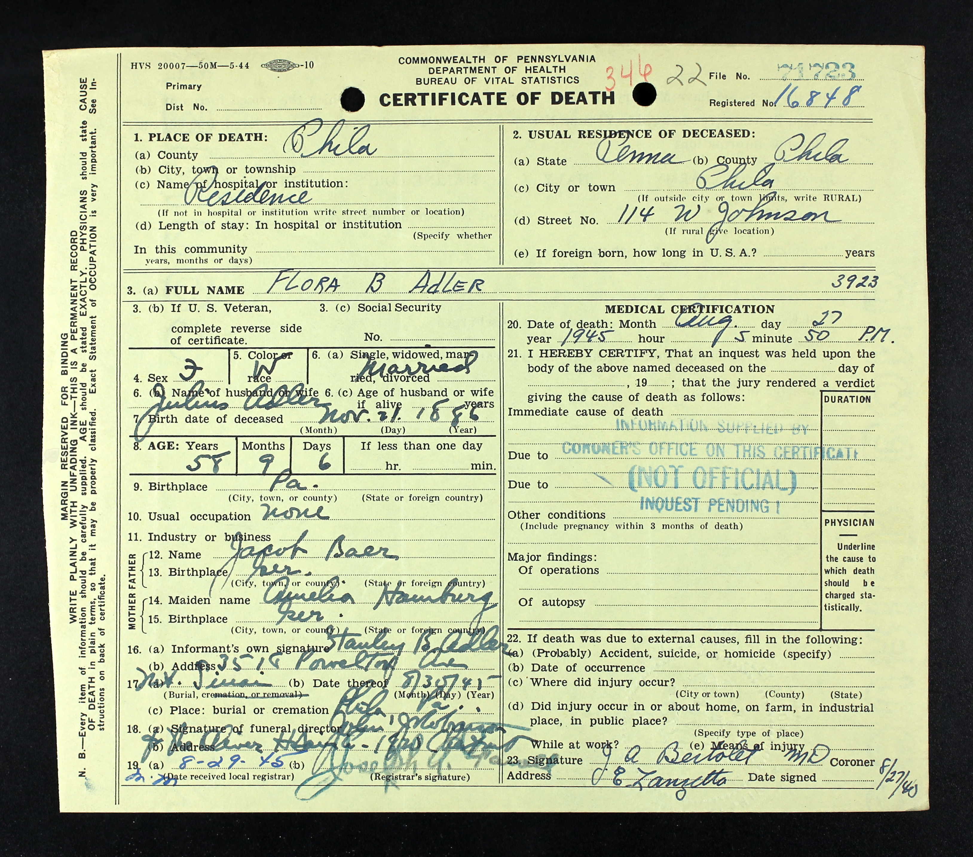 Melinda also recalled meeting Elsie and Jerome. She described a lunch she had at their home in New York City in 1963 where Elsie spoke about the fact that no one had known about the marriage between MJ and Bossie. And when I reviewed MJ’s death certificate, I saw that Jerome had been the informant on that record; strangely enough he reported that MJ was single when he died. Either Jerome had not known there had been a marriage or he was still covering up the secret marriage from the rest of the Baer family. Melinda said that she didn’t think anyone but Bossie’s daughter Margaret knew about the marriage until after MJ died.