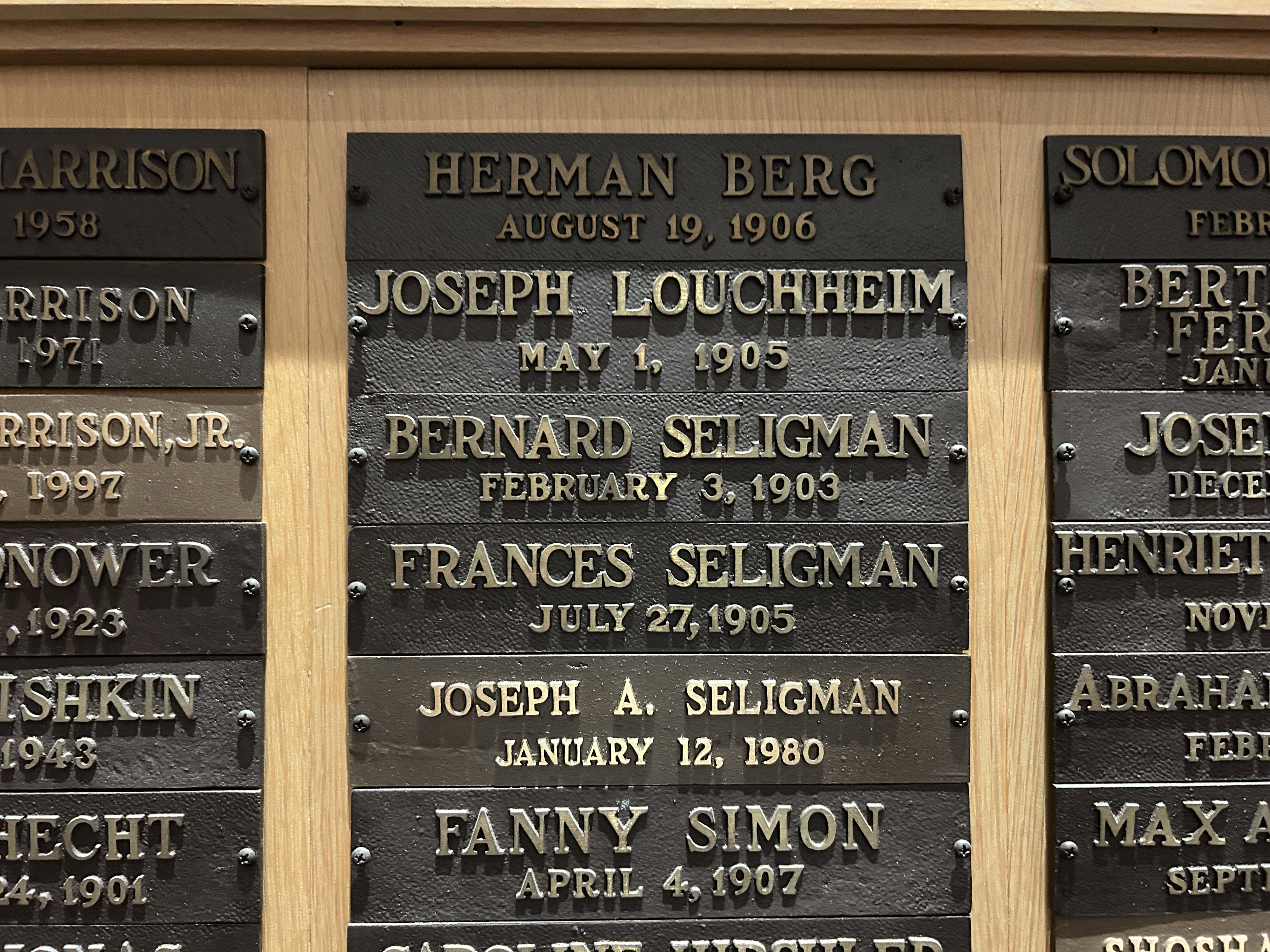 I wrote to Congregation Keneseth Israel, now located in the suburbs of Philadelphia, asking about my great-great-grandparents’ plaque, and I was quite moved and relieved to learn that it still exists on their memorial wall in their suburban location. Their executive director Brian Rissinger kindly sent me this image of the plaques: