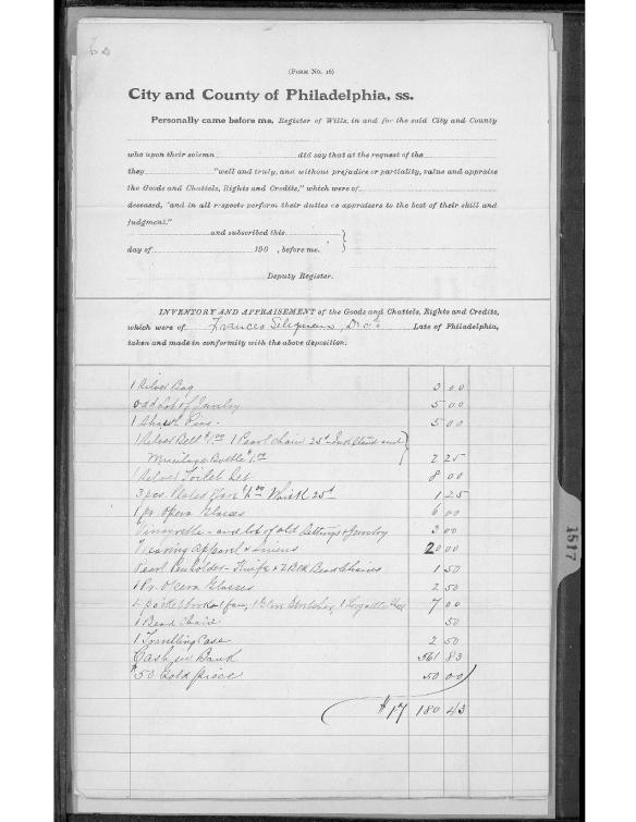 There were two inventories of Frances’ property. The bulk of her property was inventoried in September 1905 and included stock, cash, jewelry, and other personal items.1