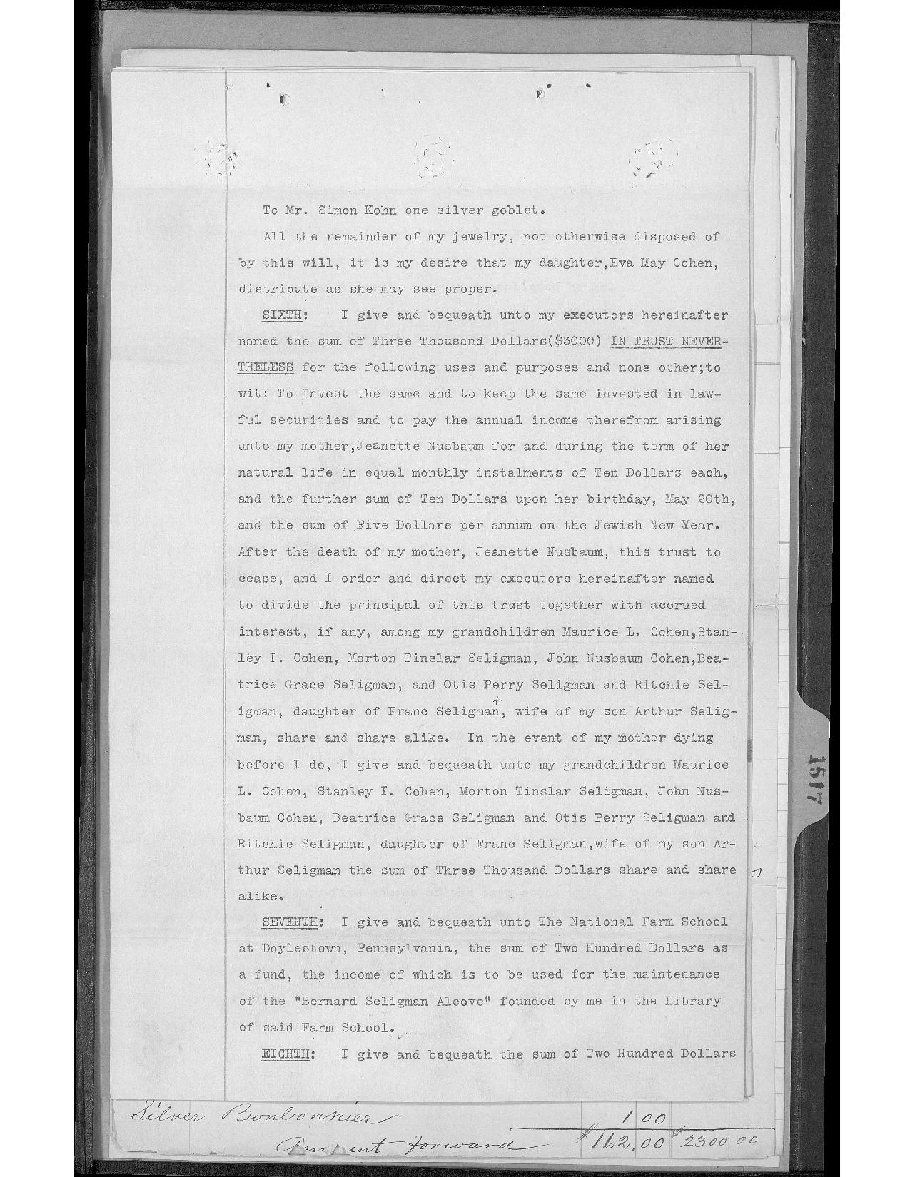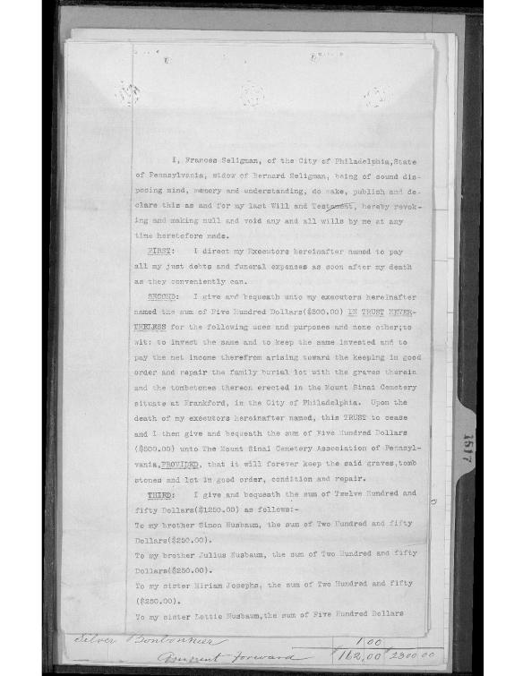 There is also a handwritten codicil to the will dated February 18, 1905. It includes additional specific bequests of various items of personal property and also provides that $200 was to be given to Congregation Keneseth Israel for the purpose of “placing the names of my husband Bernard Seligman and my own, together with the dates of our respective deaths, upon the memorial tablet on the North-East Wall of the Synagogue.” We all want to be remembered, don’t we?