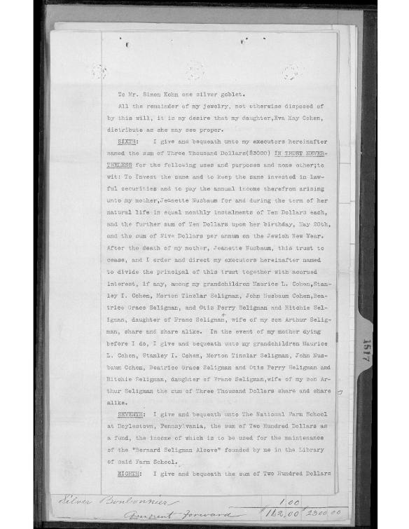 Having cleared the air on that, I am now looking at the Sixth Clause (see above). It provides in part for a $3000 trust for Frances’ mother Jeanette Dreyfus Nusbaum, my three-times great-grandmother, who was still living when Frances drew up this will in 1905. I love that Frances provided for her mother and even specified that she receive ten dollars on her birthday (May 20) and five dollars at the Jewish New Year in addition to the ten dollar regular monthly payments under this provision. It shows me how caring Frances was and also how much being Jewish was still an important part of the family’s life. Jeanette was 87 when the will was executed, and she outlived her daughter Frances, dying on January 12, 1908, at the age of 90.