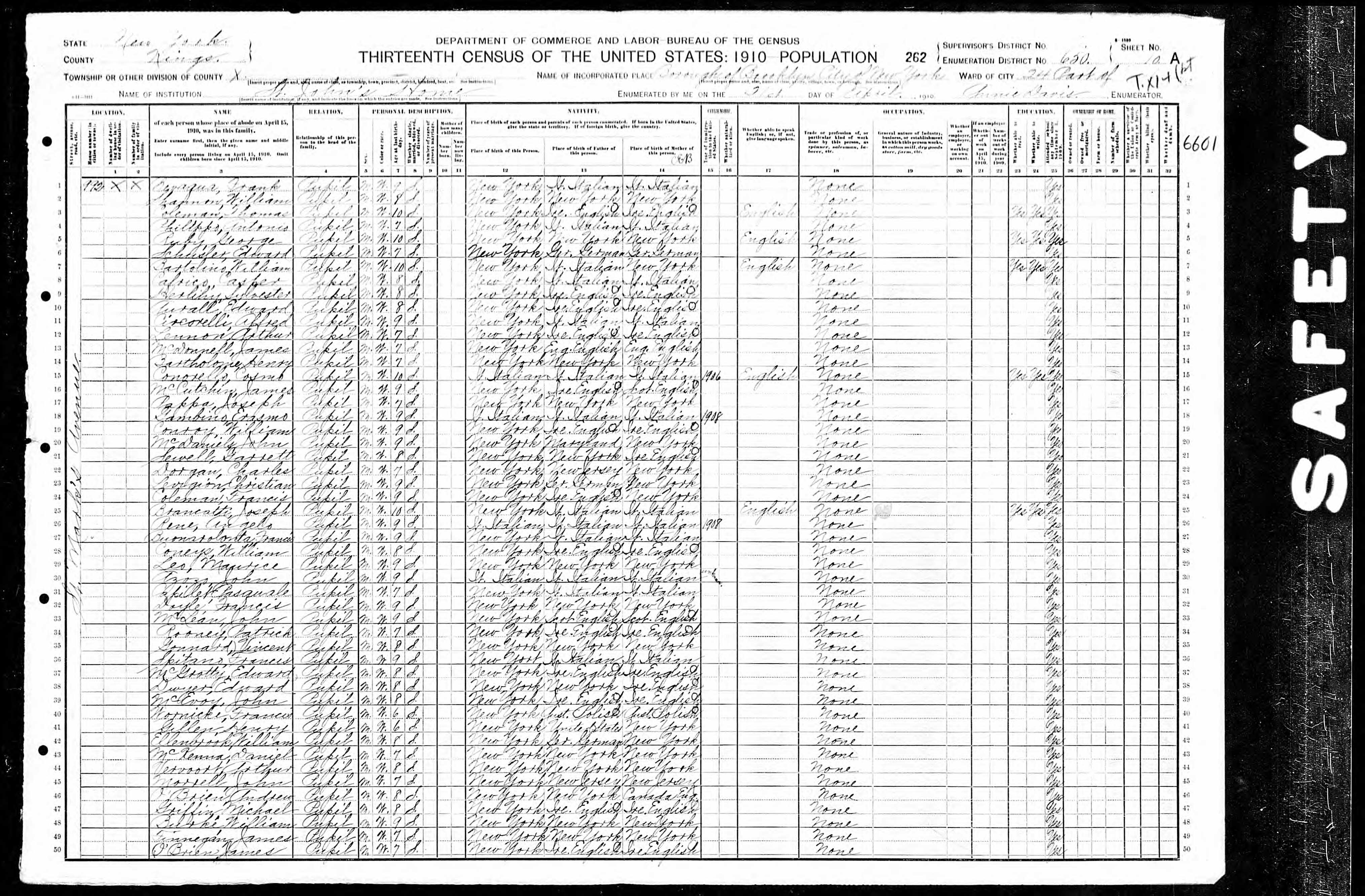 Ben was born in Chicago in 1893. He enlisted in the US Army in November, 1917, and served during World War I until he was honorably discharged in January, 1919. Ray and Ben’s first child Jerome was born in June 1919, and as of 1920, Ben was working as a foreman in a dressmaking shop (perhaps this is where he had met Ray?). By 1925, Ray and Ben had two sons, Jerome born in 1919, and Paul, born in December, 1920, and the family had moved to the Bronx. Ben was now working as a chauffeur. Their third son, Harold, was born in October, 1924, and Ben and Ray’s youngest child Thelma was born in 1926.